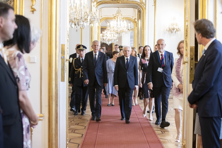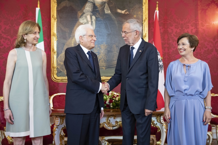Il Presidente Sergio Mattarella e la Sig.ra Laura, alla Hofburg, con il Presidente Federale della Repubblica d'Austria Alexander Van der Bellen, e consorte, Doris Schmidauer,in occasione della visita di Stato nella Repubblica d'Austria