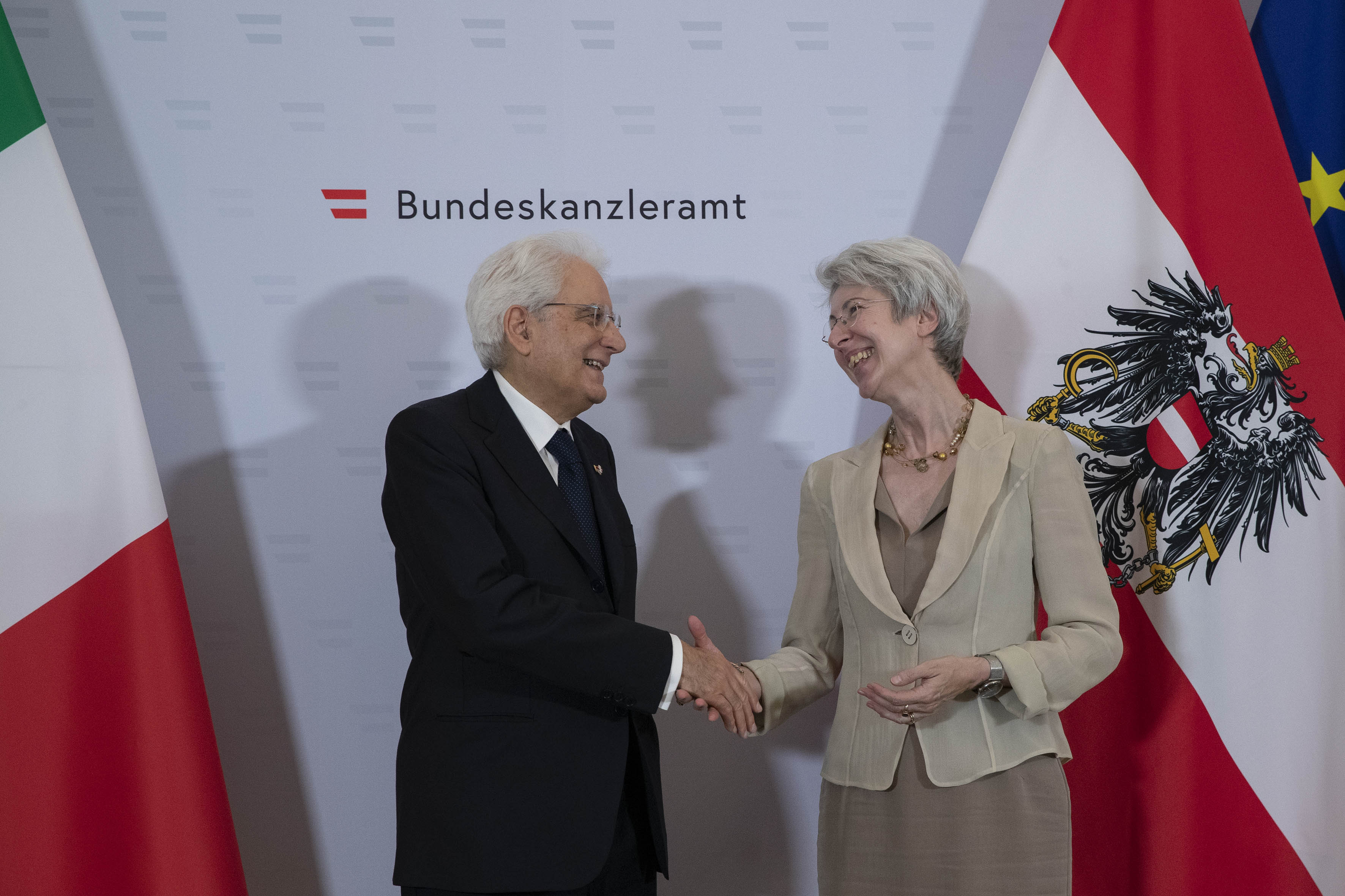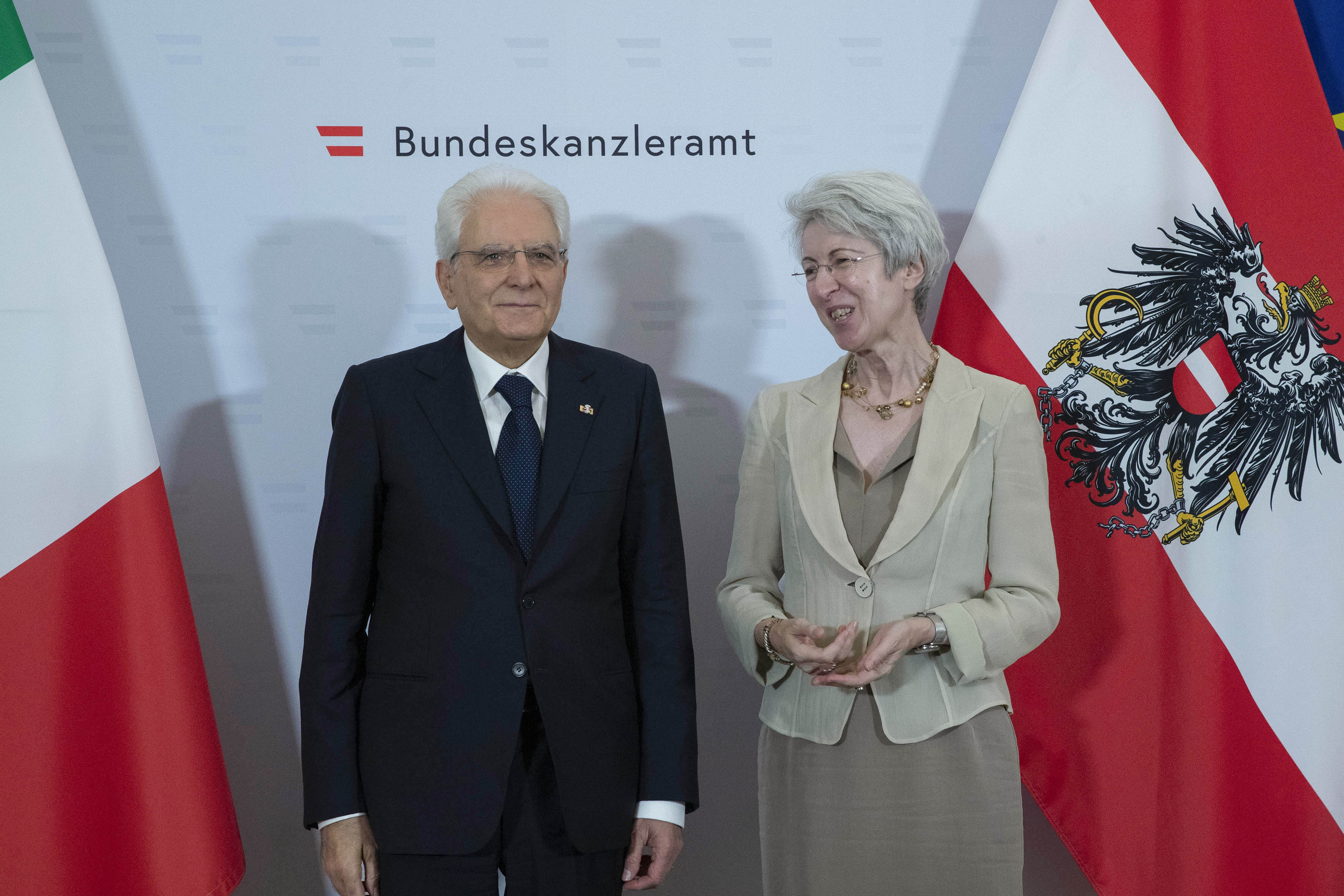 Il Presidente Sergio Mattarella al Palazzo della Cancelleria Federale con il Ministro della Digitalizzazione e dell'Economia, Elisabeth Udolf-Strobl, in occasione della visita di Stato nella Repubblica d'Austria.