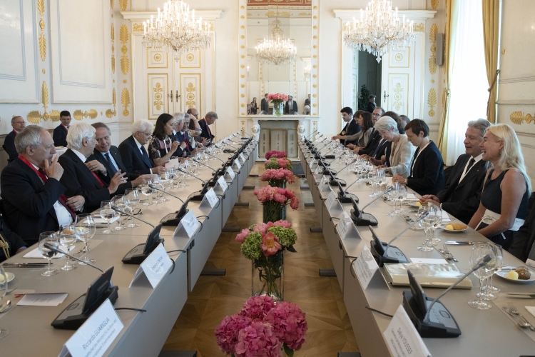 Il Presidente Sergio Mattarella al Palazzo della Cancelleria Federale nel corso dell'incontro con il Ministro della Digitalizzazione e dell'Economia, Elisabeth Udolf-Strobl e le rispettive delegazioni