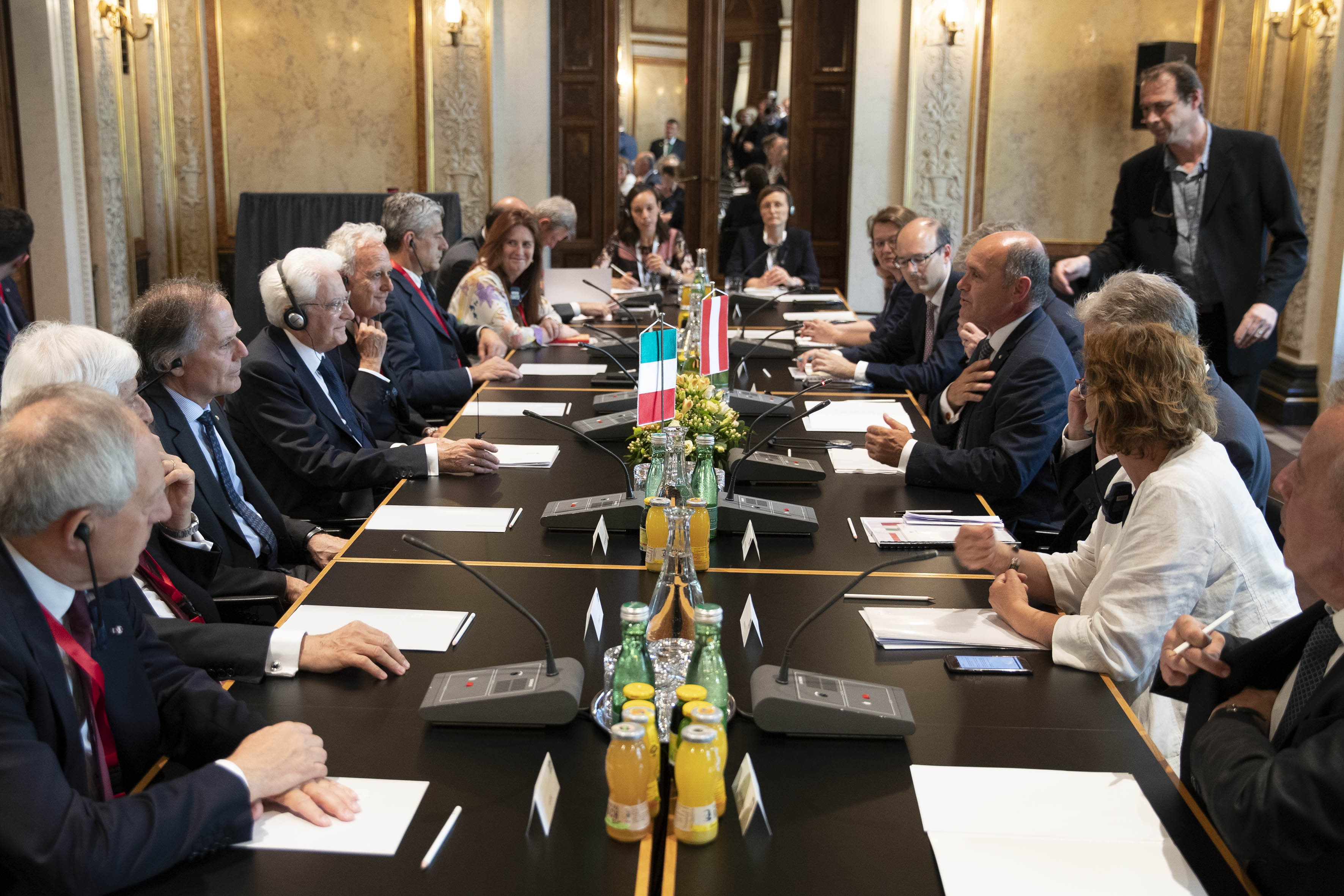 Il Presidente Sergio Mattarella a Palazzo Epstein durante i colloqui con il Presidente del Consiglio Nazionale, Wolfgang Sobotka, e le rispettive delegazioni, in occasione della visita di Stato nella Repubblica d'Austria.