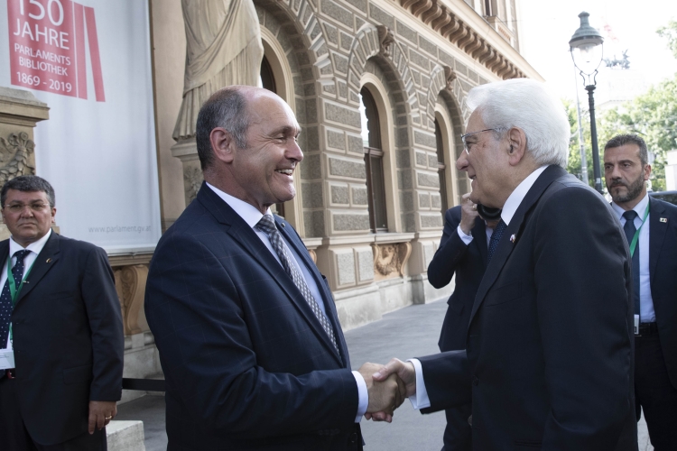 Il Presidente Sergio Mattarella a Palazzo Epstein accolto dal Presidente del Consiglio Nazionale,Wolfgang Sobotka, in occasione della visita di Stato nella Repubblica d'Austria