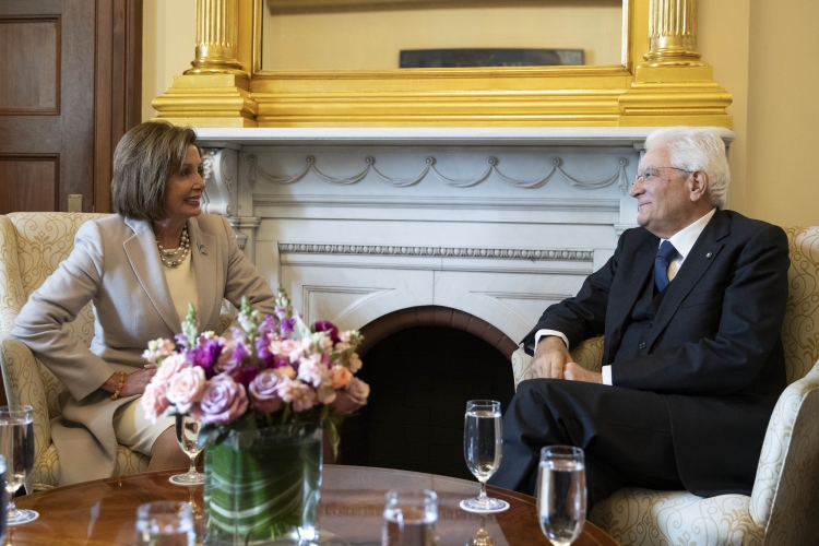 Il Presidente Sergio Mattarella nel corso dei colloqui con la Presidente della Camera dei Rappresentanti, Nancy Pelosi, in occasione della Visita Ufficiale negli Stati Uniti d'America