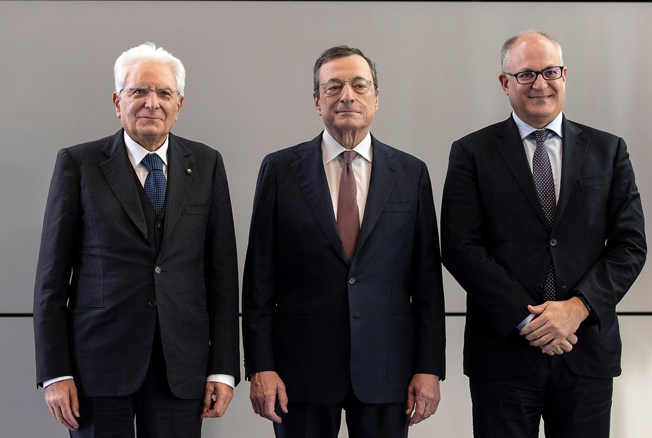 Il Presidente della Repubblica Sergio Mattarella con Mario Draghi, Presidente della Banca Centrale Europea, e il Ministro Gualtieri
