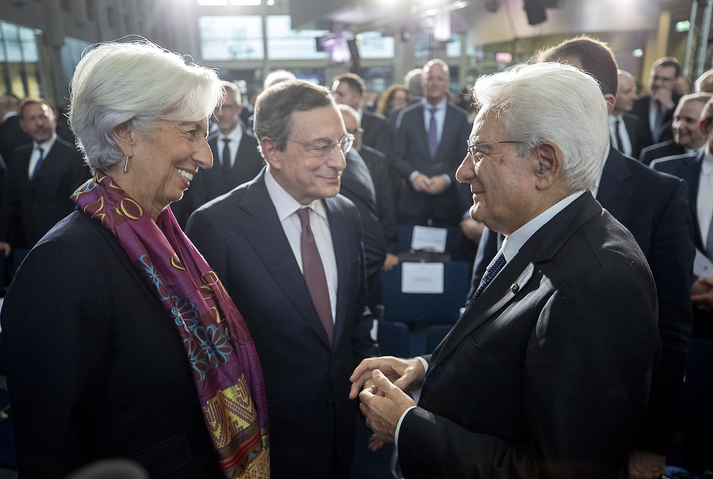 Il Presidente della Repubblica Sergio Mattarella con Mario Draghi, Presidente della BCE e Chrisitne Lagarde, Presidente designata della Banca Centrale Europea