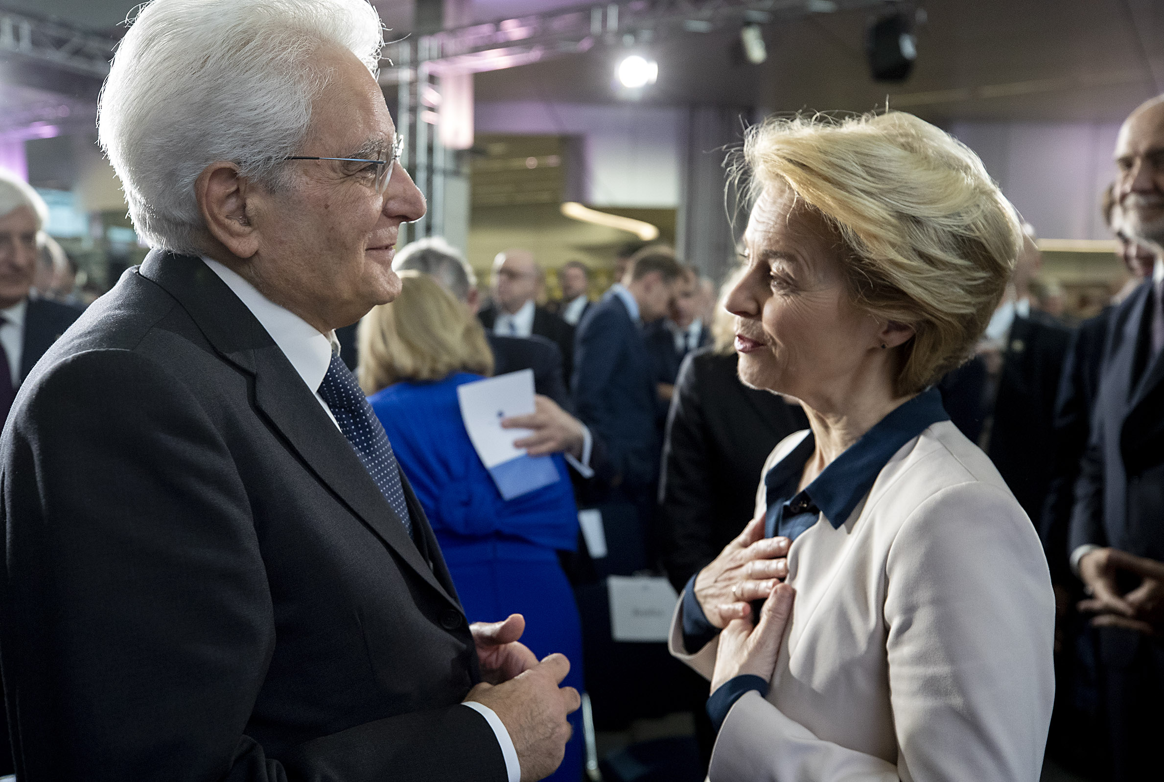 Il Presidente della Repubblica Sergio Mattarella con Ursula von der Leyen, in occasione della cerimona di commiato del Presidente della Banca Centrale Europea Mario Draghi