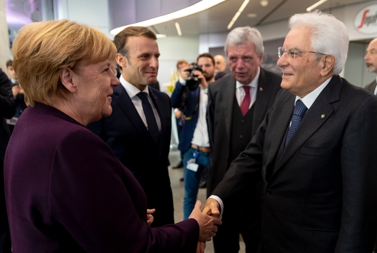 Il Presidente della Repubblica Sergio Mattarella in occasione della cerimona di commiato del Presidente della Banca Centrale Europea Mario Draghi, con Angela Merkel e Emmanuel Macron