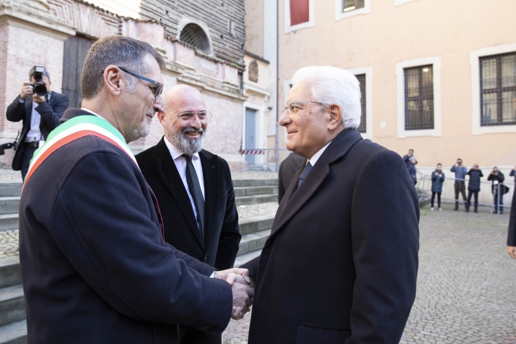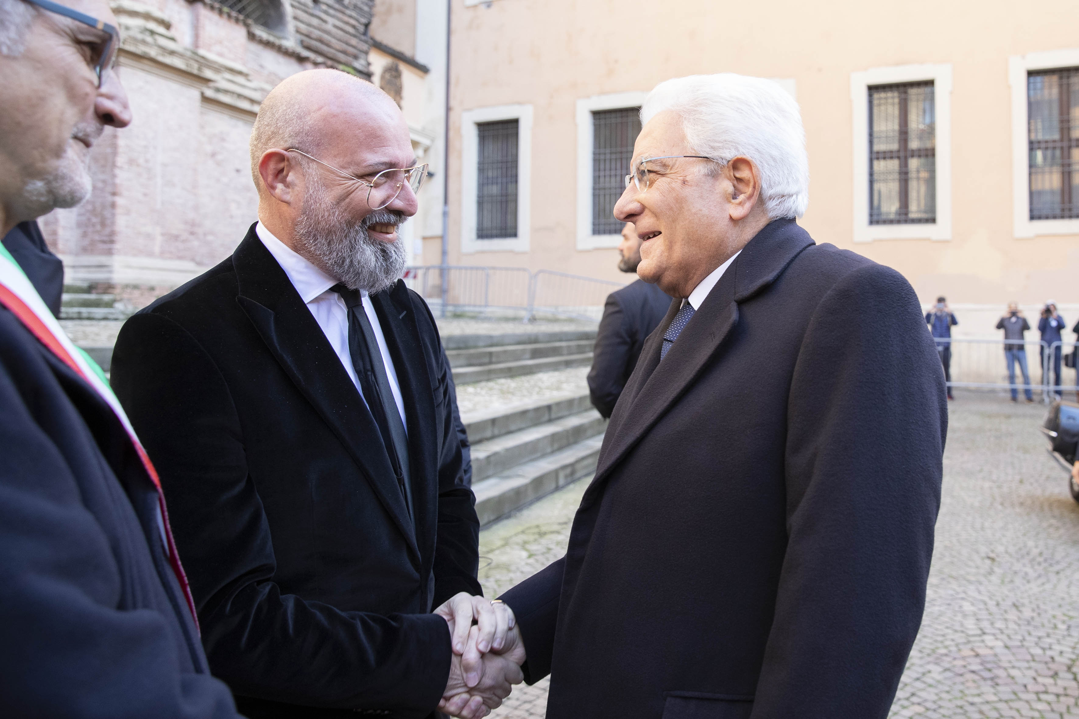 Il Presidente della Repubblica Sergio Mattarella,accolto da Stefano Bonaccini, Presidente Regione Emilia Romagna, in occasione della cerimonia di conferimento del Sigillum Magnum al Presidente della Repubblica Portoghese