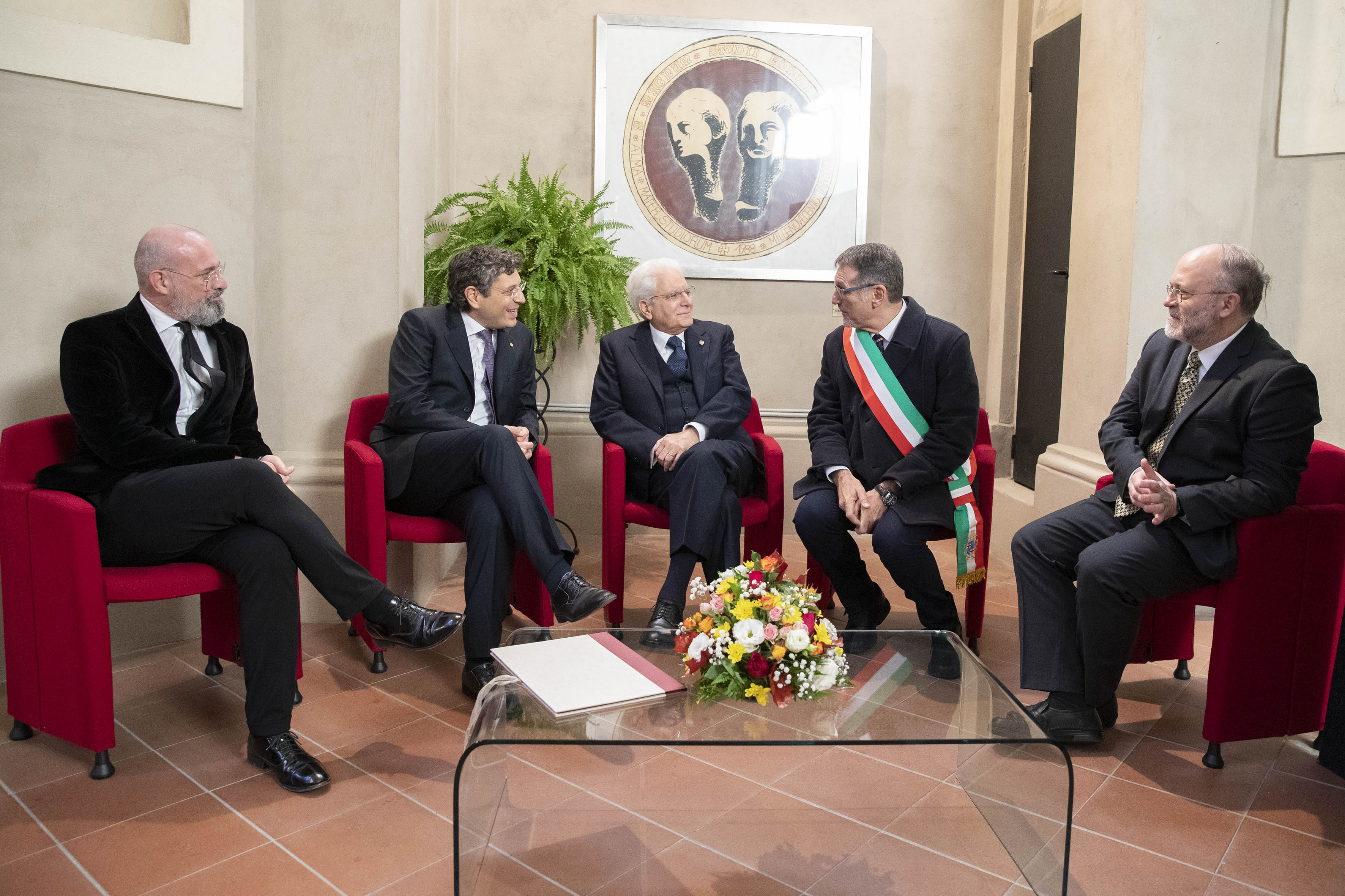 Il Presidente della Repubblica Sergio Mattarella con Stefano Bonaccini, Presidente Regione Emilia Romagna, Virginio Merola, Sindaco di Bologna, Francesco Ubertini, Rettore dell’Università di Bologna, Roberto Vecchi, Ordinario di Letteratura Portoghese e Brasiliana presso l'Università di Bologna, in occasione della cerimonia di conferimento del Sigillum Magnum al Presidente della Repubblica Portoghese