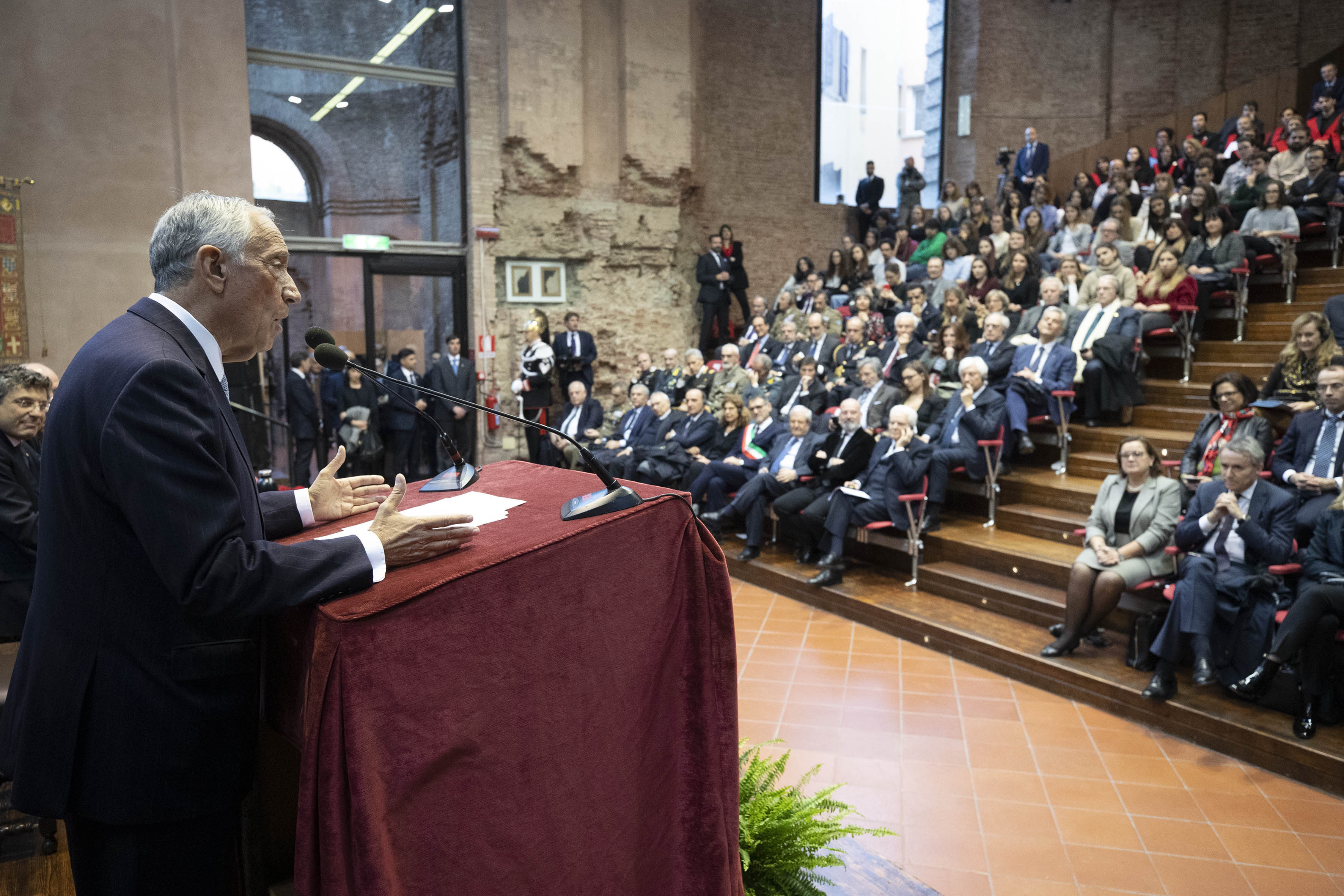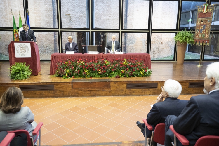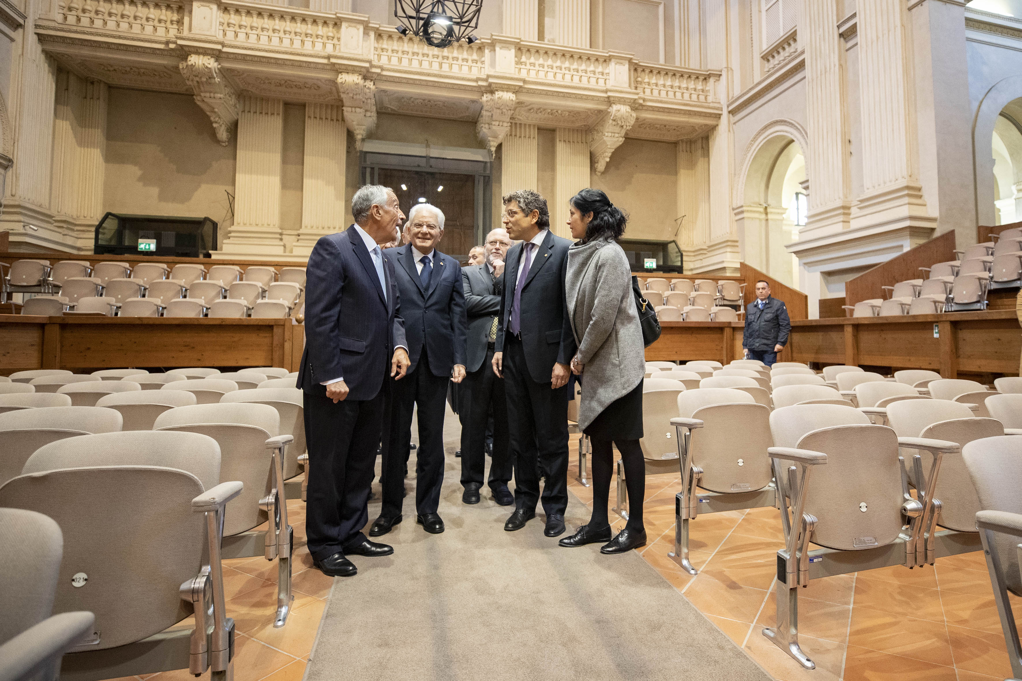 Il Presidente della Repubblica Sergio Mattarella con il Presidente Repubblica Portoghese, Marcelo Nuno Duarte Rebelo de Sousa, e con Francesco Ubertini, Rettore dell’Università di Bologna, in occasione della cerimonia di conferimento del Sigillum Magnum al Presidente della Repubblica Portoghese