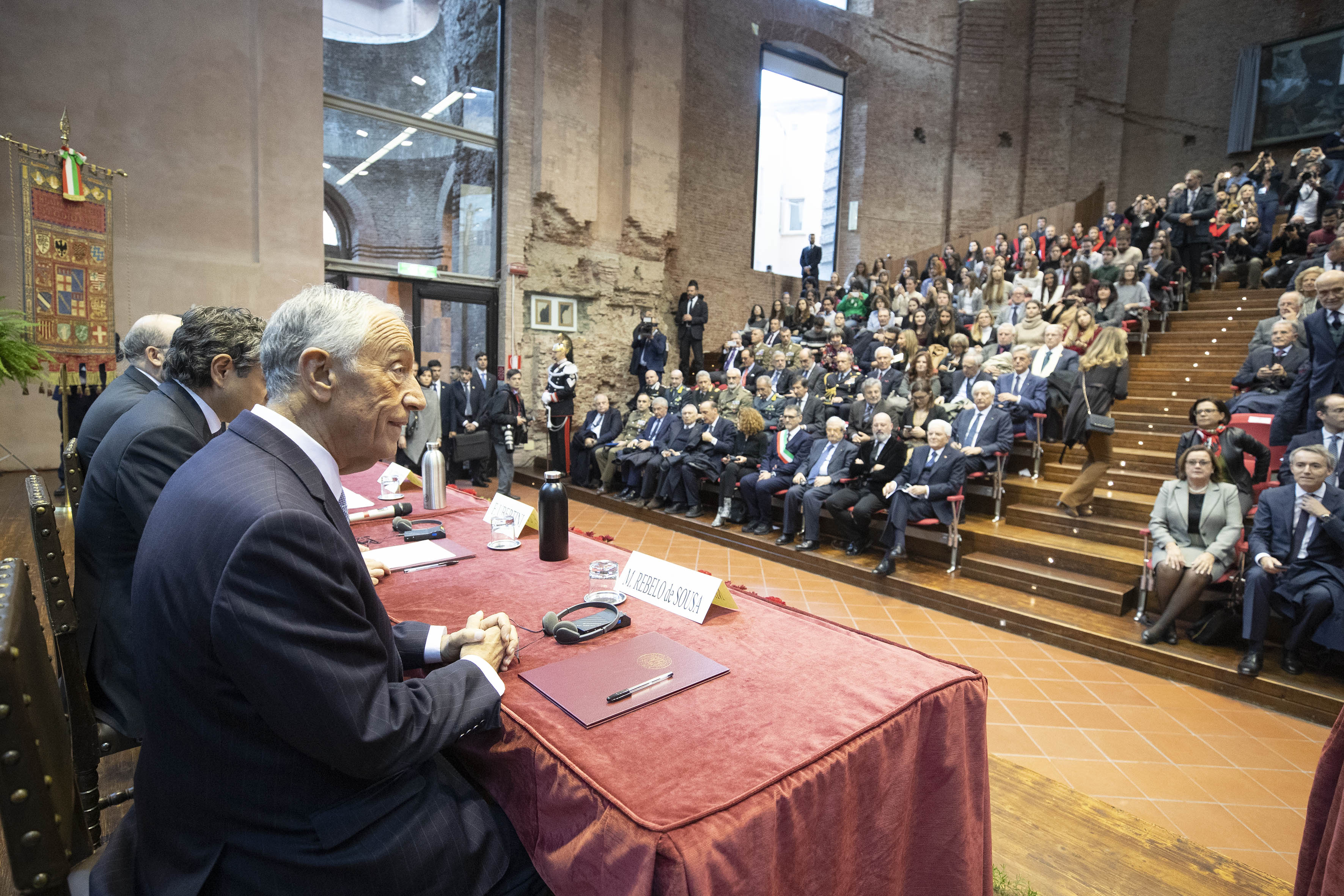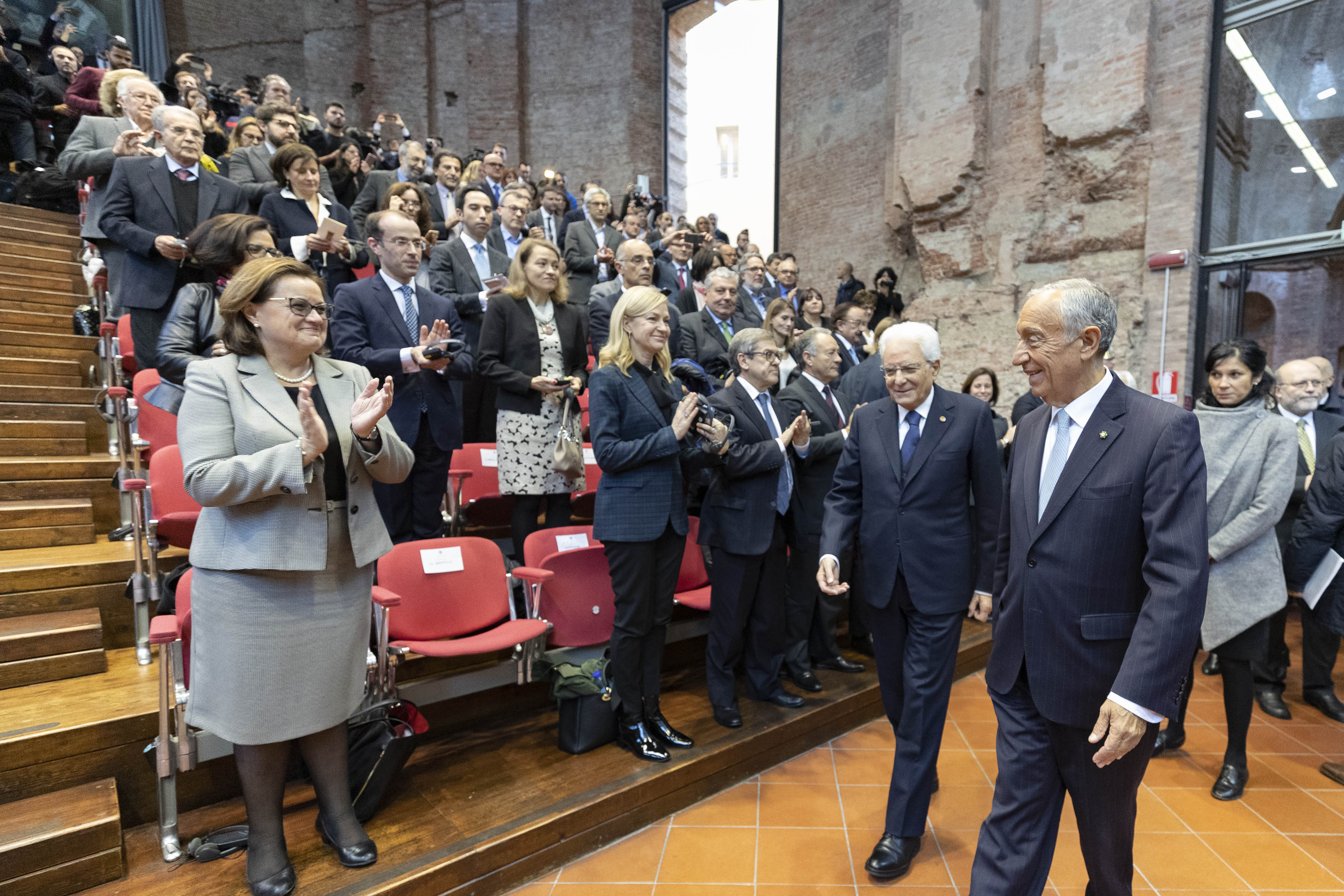 Il Presidente della Repubblica Sergio Mattarella durante la lectio magistralis di Marcelo Nuno Duarte Rebelo de Sousa, Presidente della Repubblica Portoghese.
