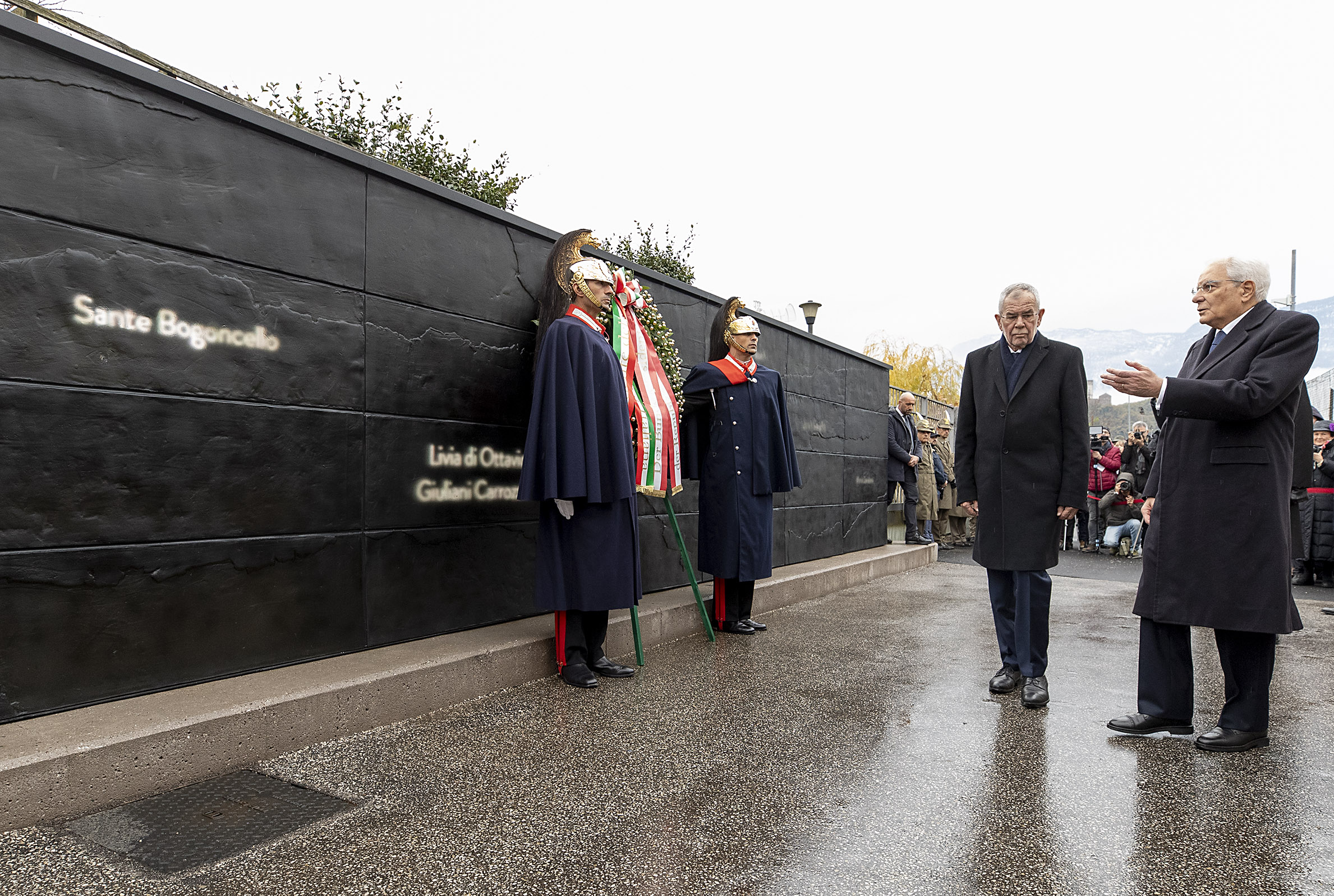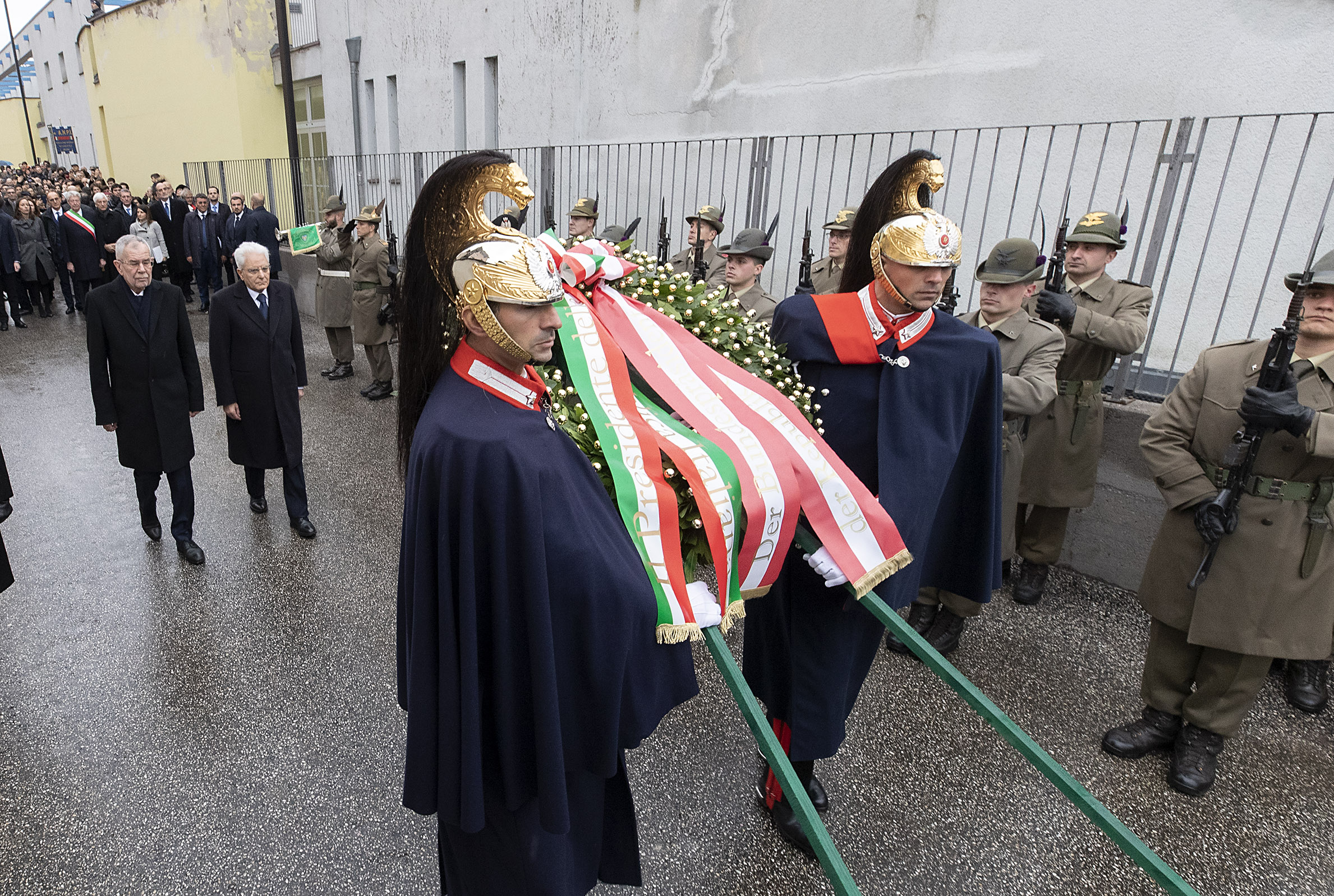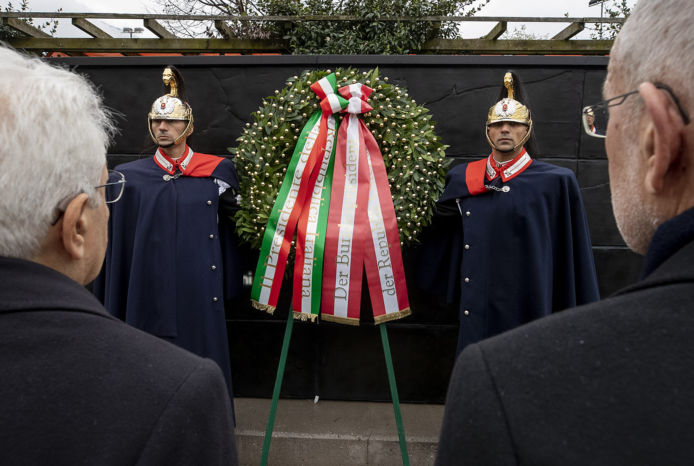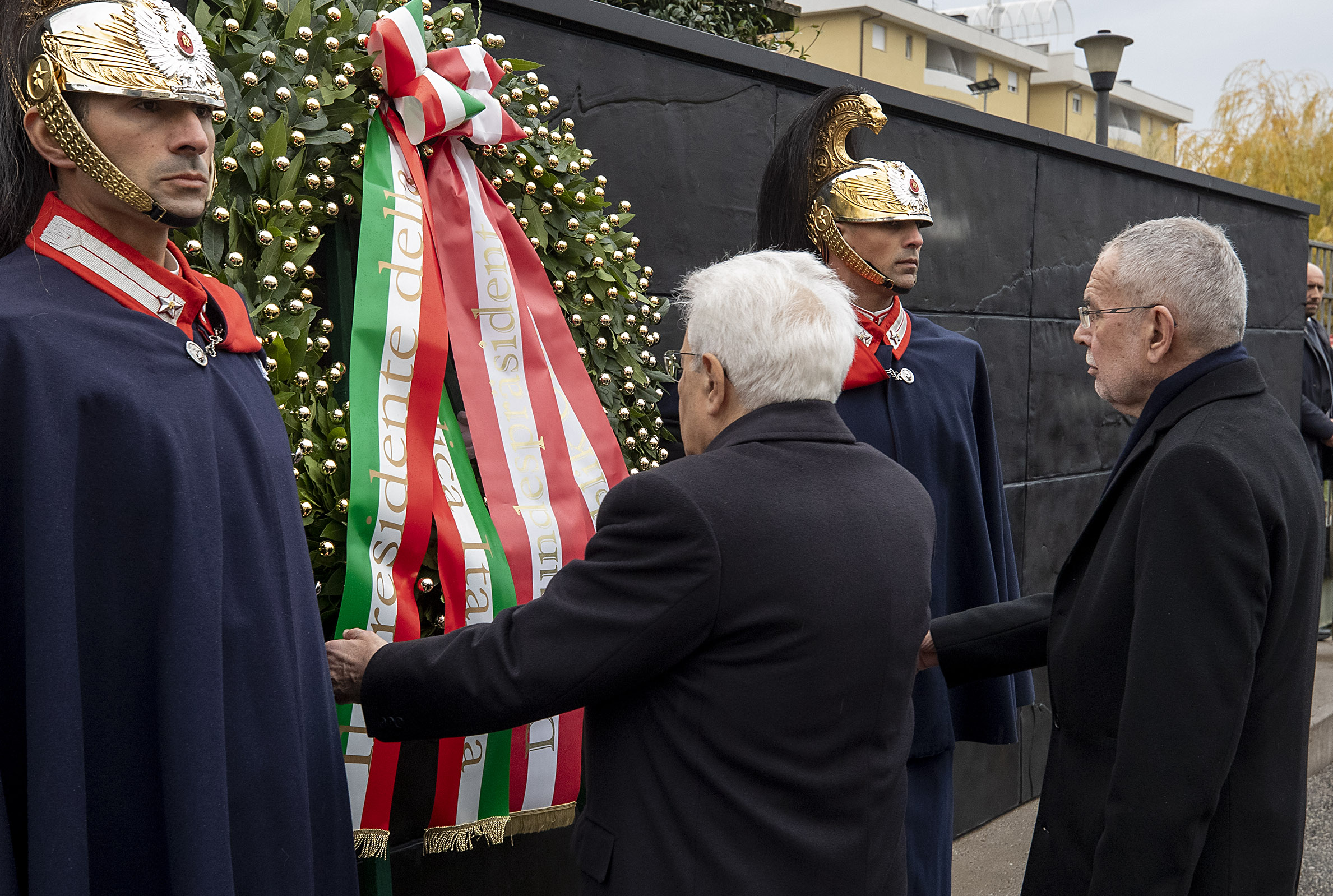 Il Presidente della Repubblica Sergio Mattarella e il Presidente della Repubblica Federale Austriaca Alexander Van der Bellen, in occasione della deposizione di una corona di alloro al monumento alla memoria, presso il Muro della Memoria