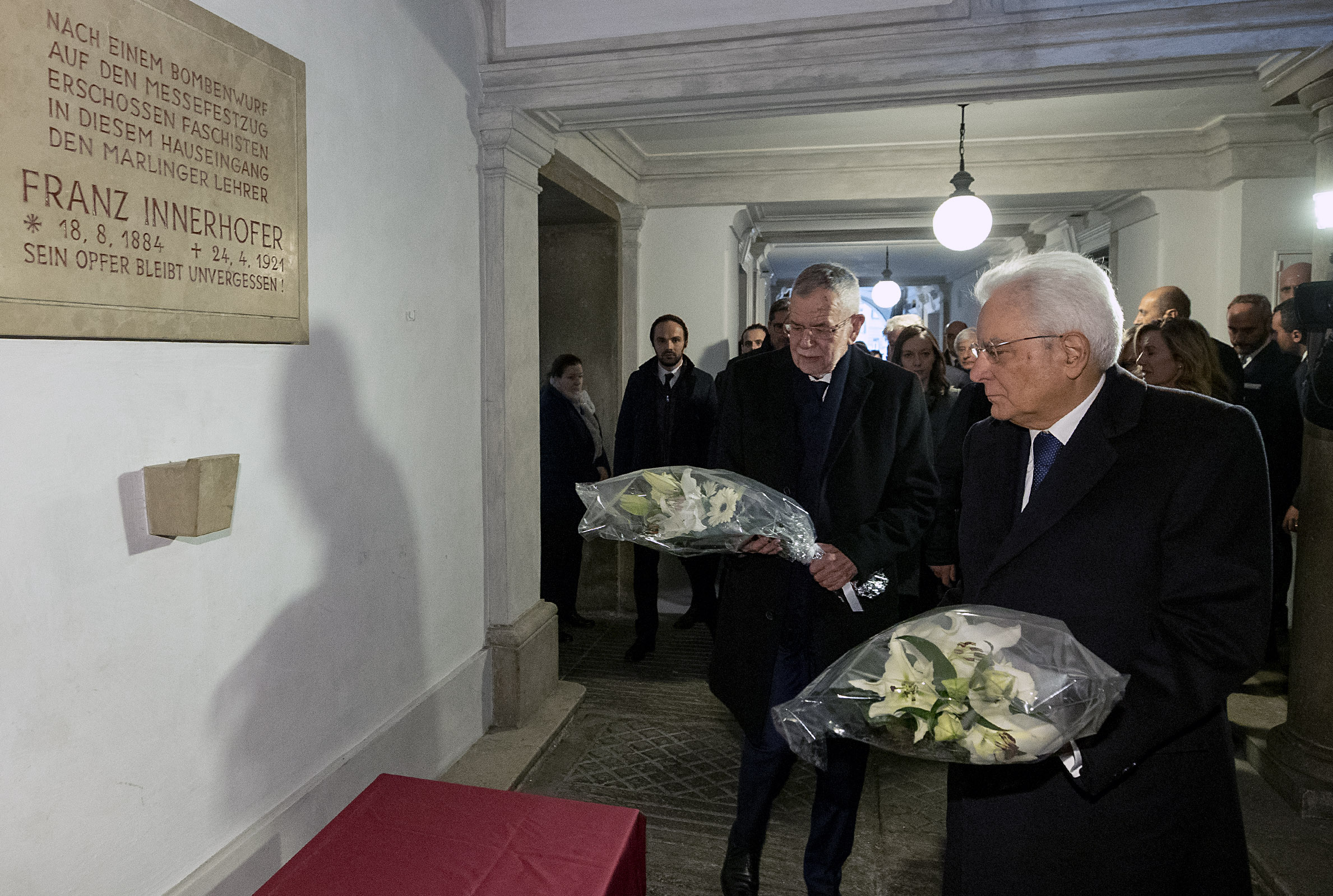 Il Presidente della Repubblica Sergio Mattarella e il Presidena e della Repubblica Federale Austriaca Alexander Van der Bellen, in occasione della deposizione di due mazzi di fiori alla base della targa a memoria del Maestro Franz Innerhofer