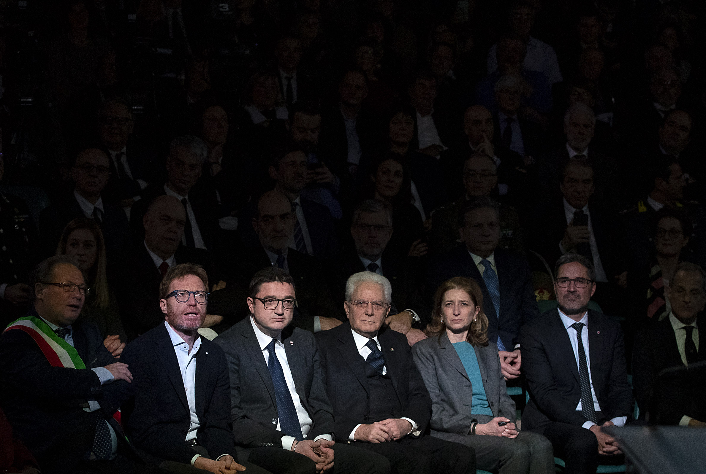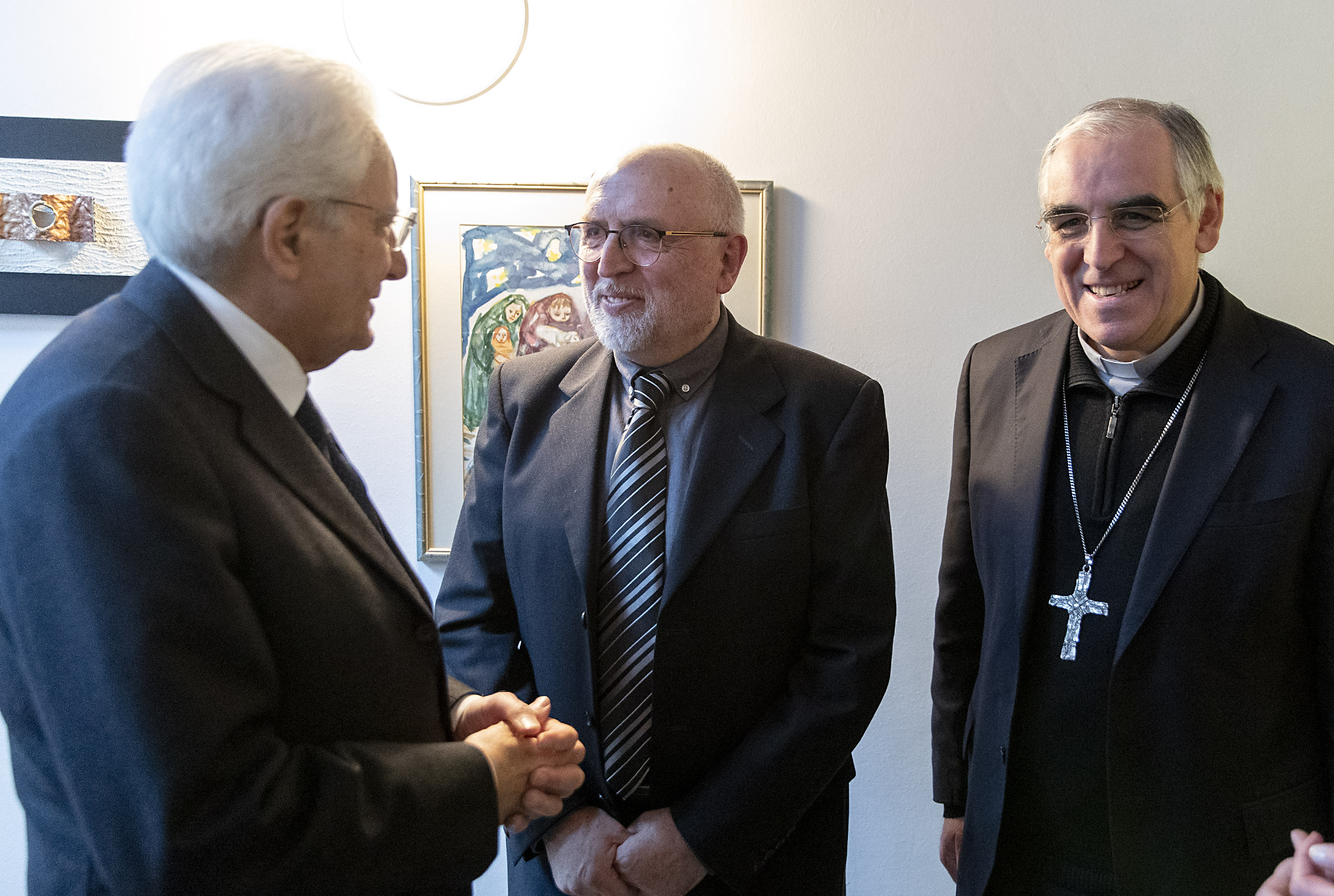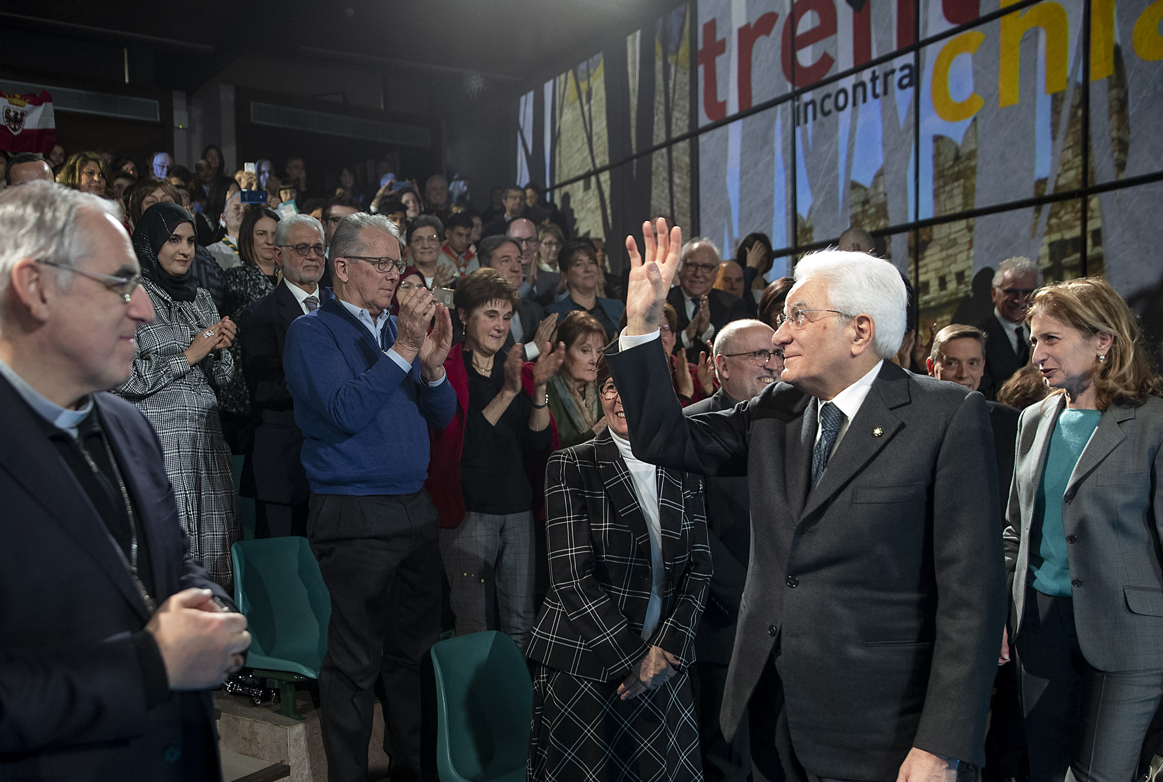 Il Presidente della Repubblica Sergio Mattarella con S.E. Rev.ma Mons. Lauro Tisi, Arcivescovo di Trento e Jesus Moran Cepedano, Co-Presidente del Movimento dei Focolari, in occasione della celebrazione in onore di Chiara Lubich, nel centenario della sua nascita