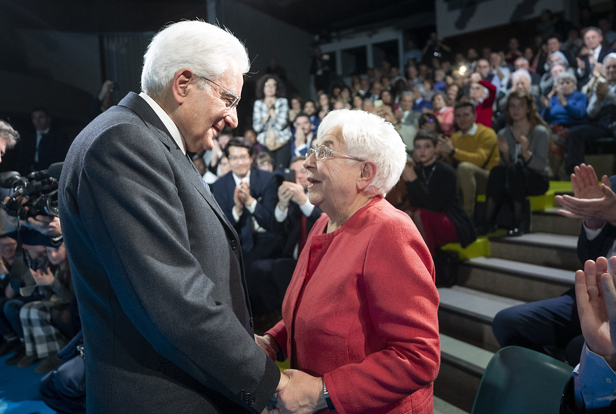 Il Presidente della Repubblica Sergio Mattarella saluta Maria Voce Emmaus, Presidente del Movimento dei Focolari, in occasione della celebrazione in onore di Chiara Lubich, nel centenario della sua nascita