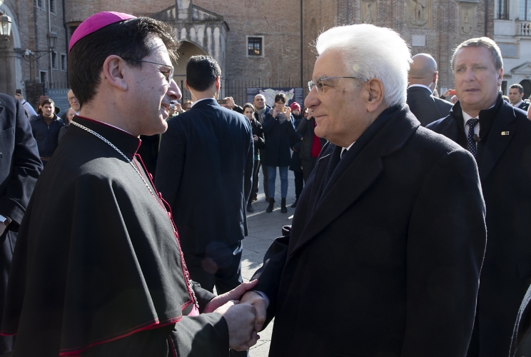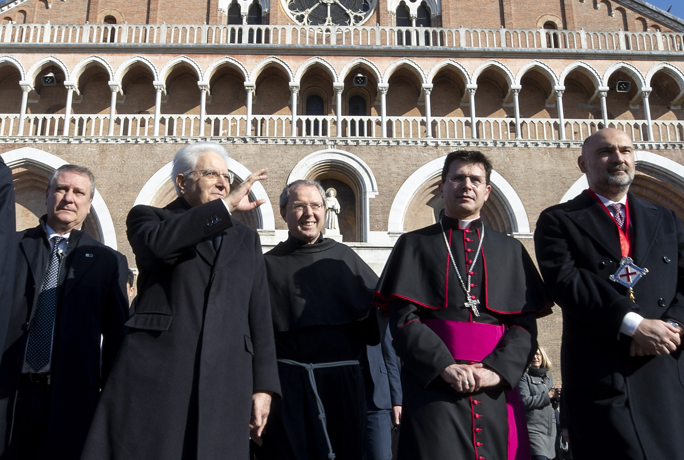 Il Presidente Sergio Mattarella al suo arrivo alla Basilica di Sant'Antonio viene accolto da S.E. Rev.ma Mons. Fabio Dal Cin, Delegato Pontificio per la Basilica