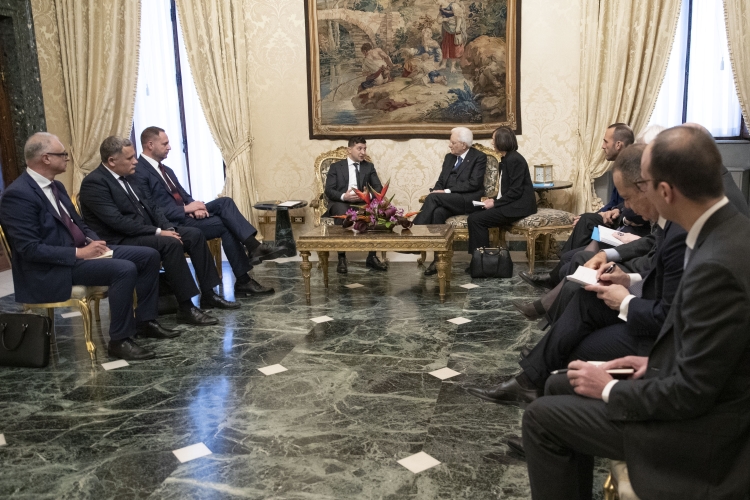 Il Presidente Sergio Mattarella con il Presidente di Ucraina, S.E. il Signor Volodymyr Oleksandrovych Zelenskyy,durante i colloqui con le rispettive delegazioni