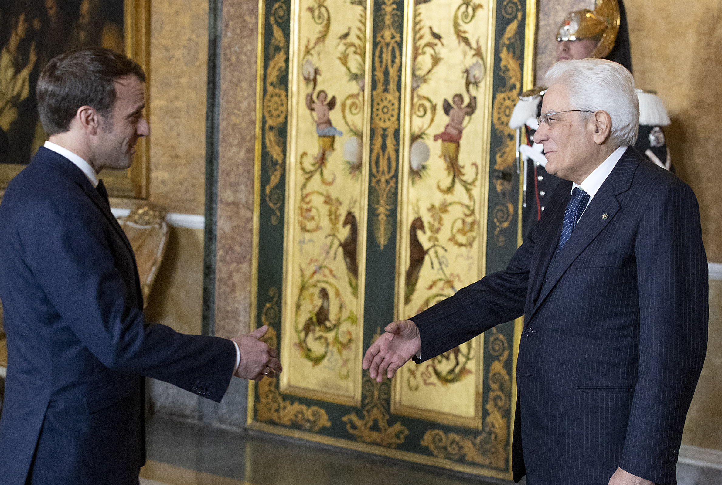 Il Presidente della Repubblica Sergio Mattarella accoglie il Presidente della Repubblica francese Emmanuel Macron in occasione del vertice italo-francese