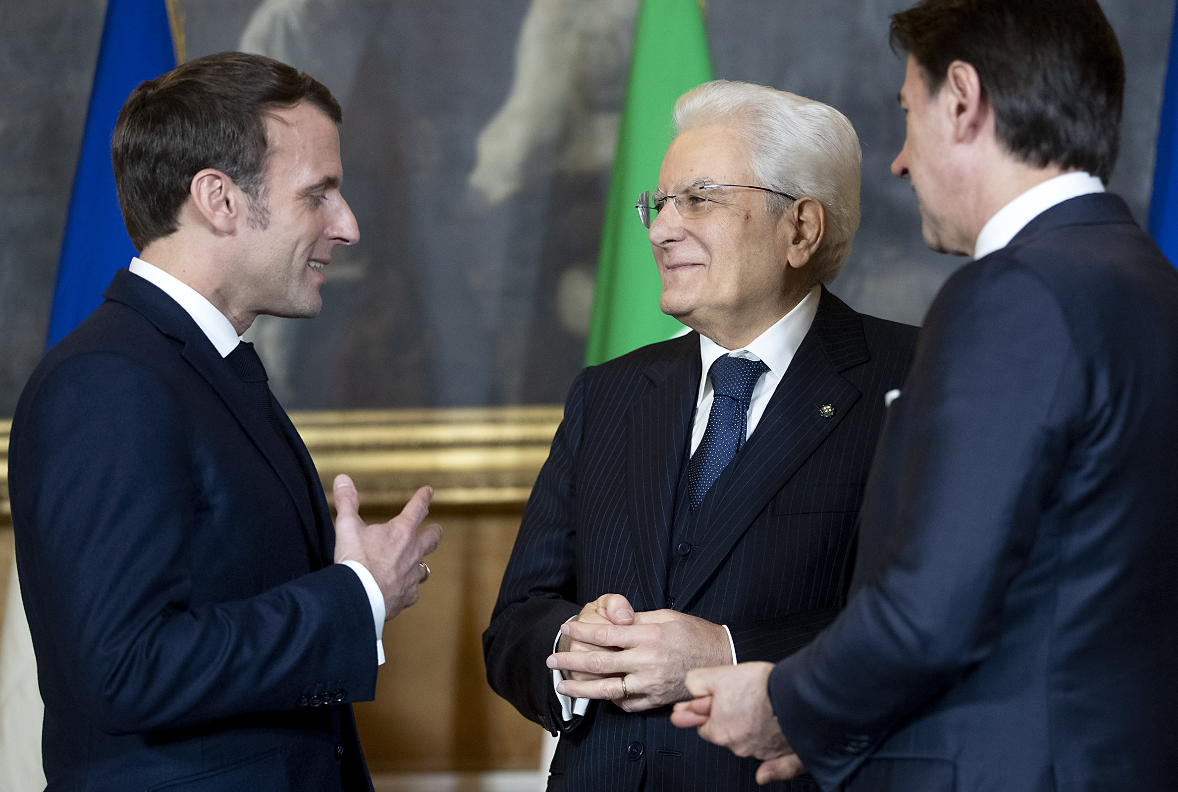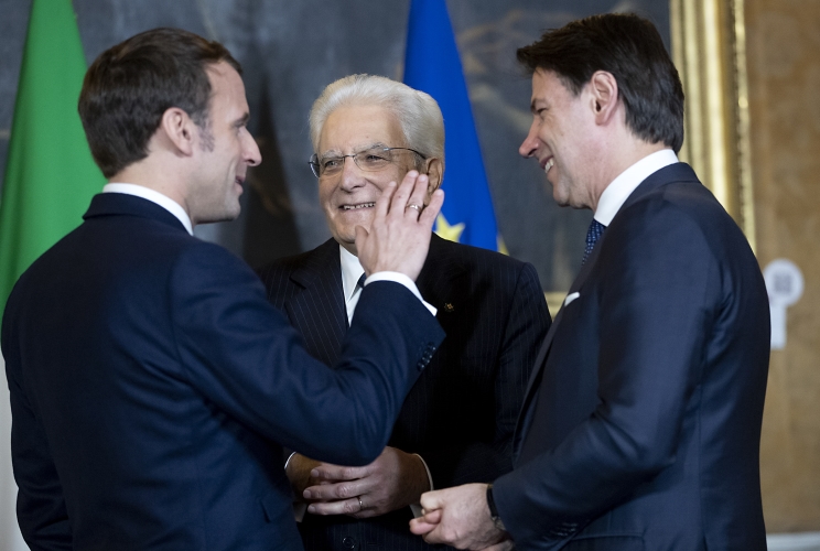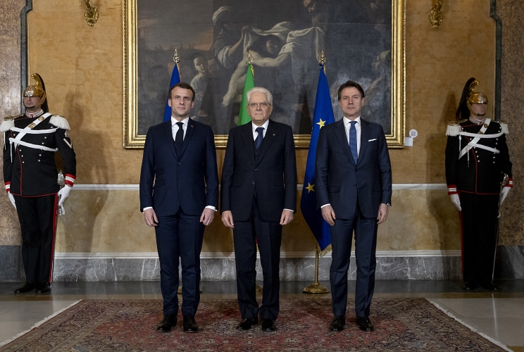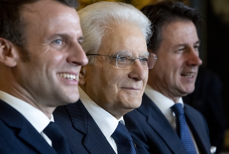 Il Presidente della Repubblica Sergio Mattarella con il Presidente della Repubblica francese Emmanuel Macron e il Presidente del Consiglio dei Ministri Giuseppe Conte in occasione del vertice italo francese
