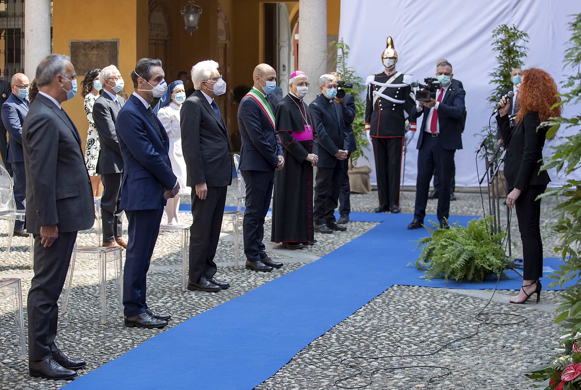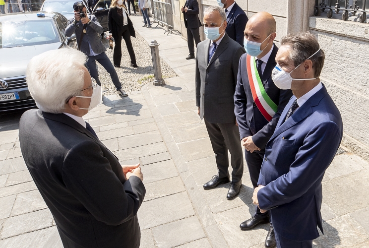 Il Presidente della Repubblica Sergio Mattarella con il Presidente della Regione Lombardia, Attilio Fontana, il Sindaco di Codogno Francesco Passerini in occasione della visita a Codogno
