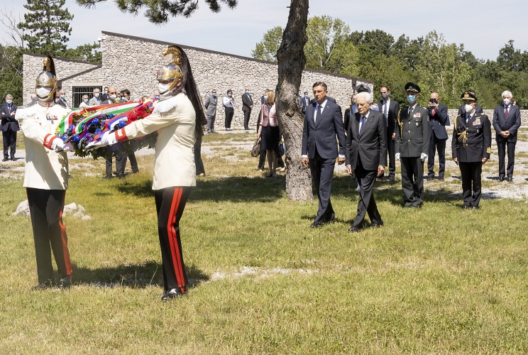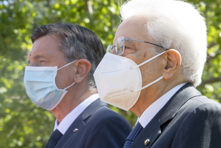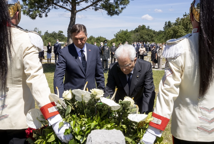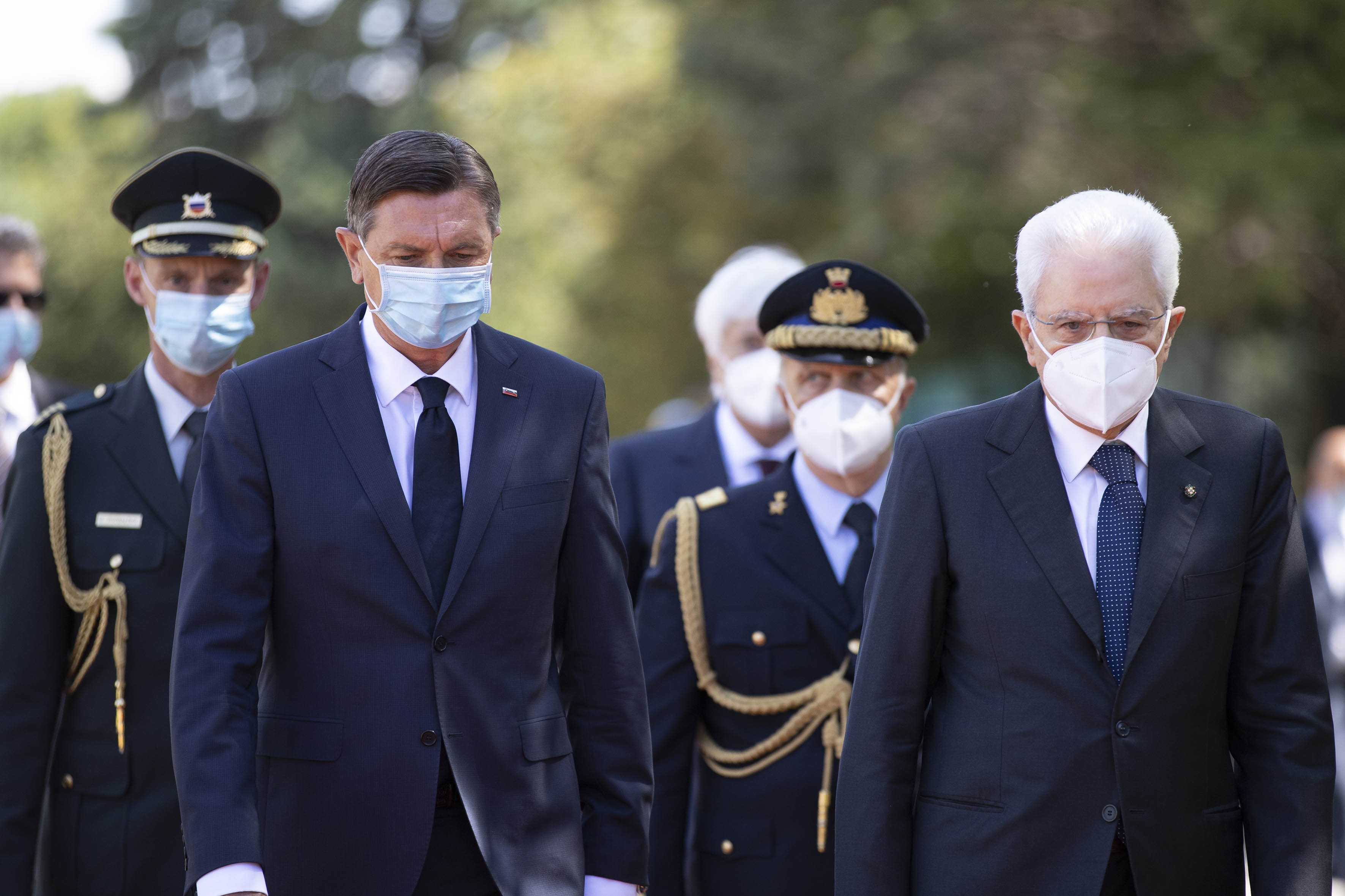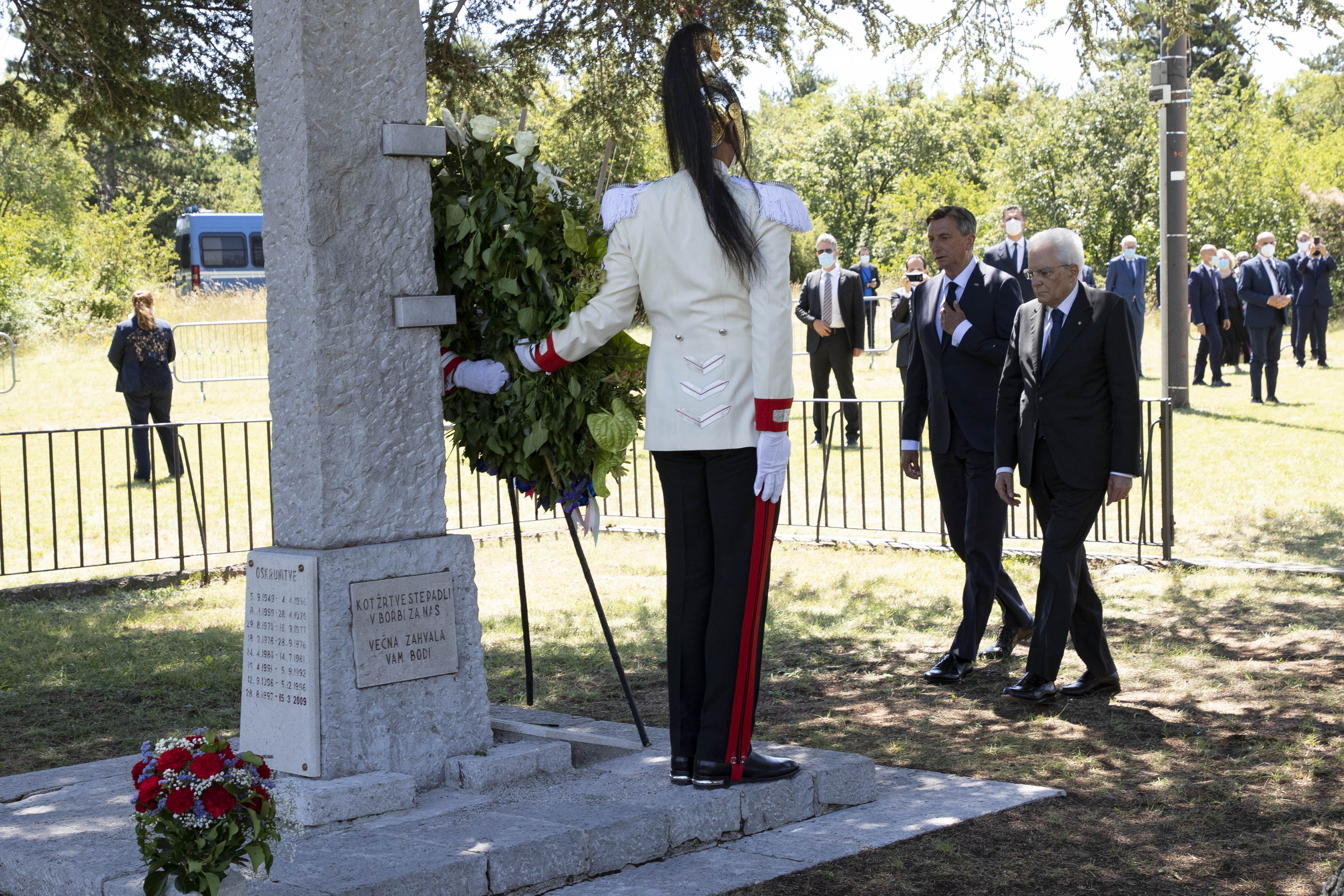 Il Presidente della Repubblica Sergio Mattarella e il Presidente della Repubblica di Slovenia, Borut Pahor depongono una corona al monumento ai caduti sloveni