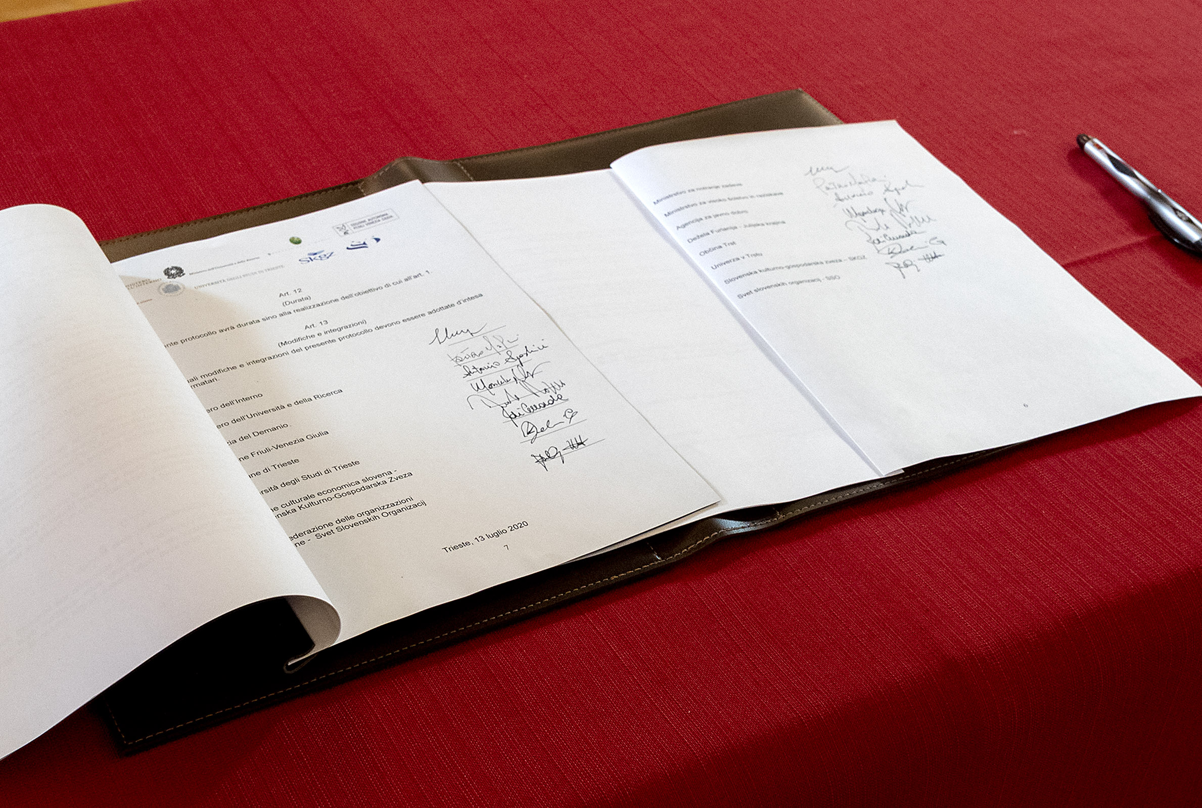 Il Presidente della Repubblica Sergio Mattarella e il Presidente della Repubblica di Slovenia Borut Pahor assistono alla firma del protocollo di restituzione del Narodni Dom
