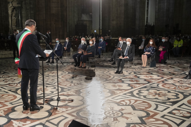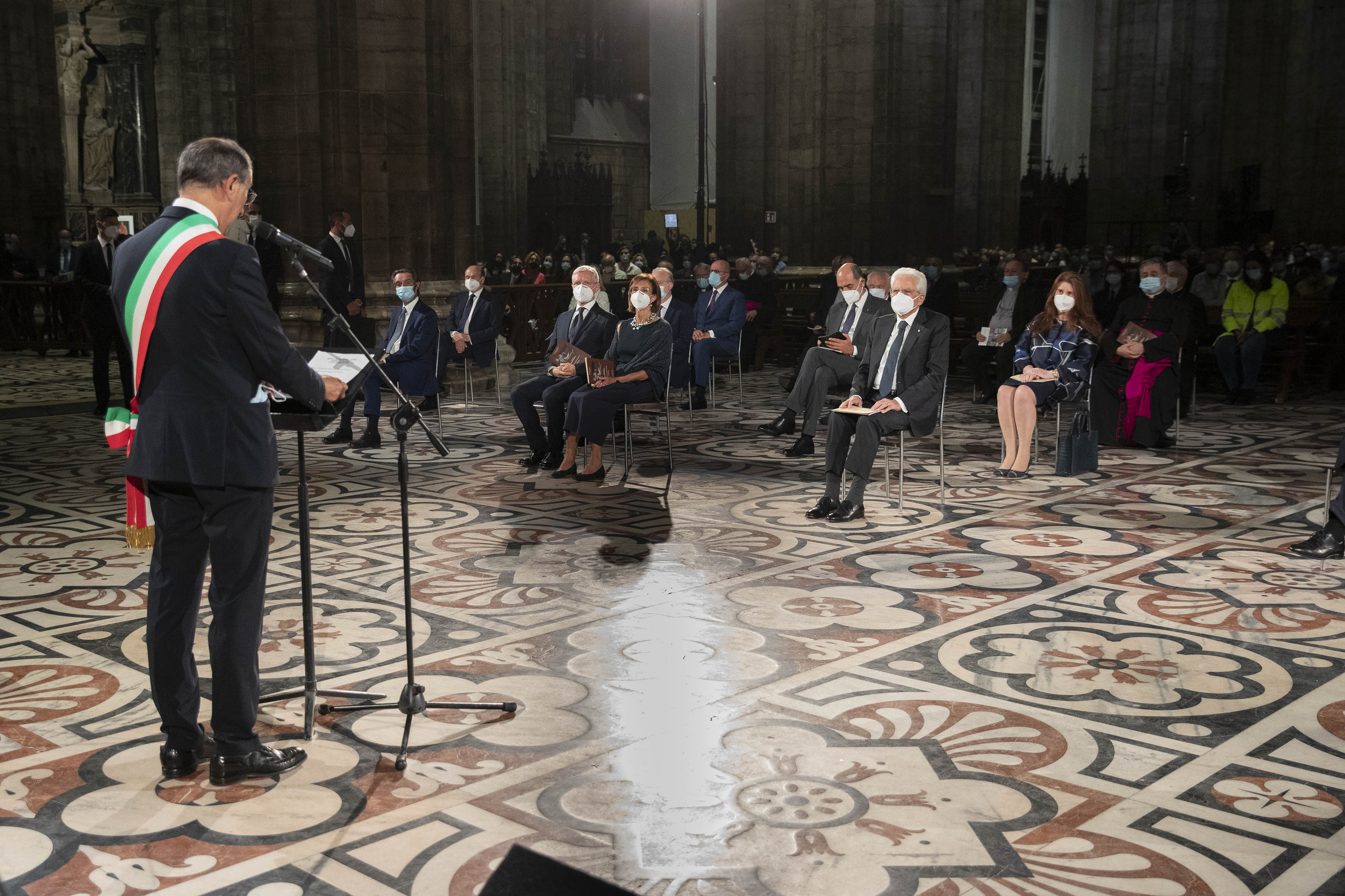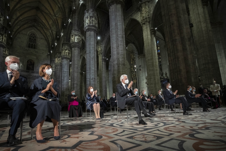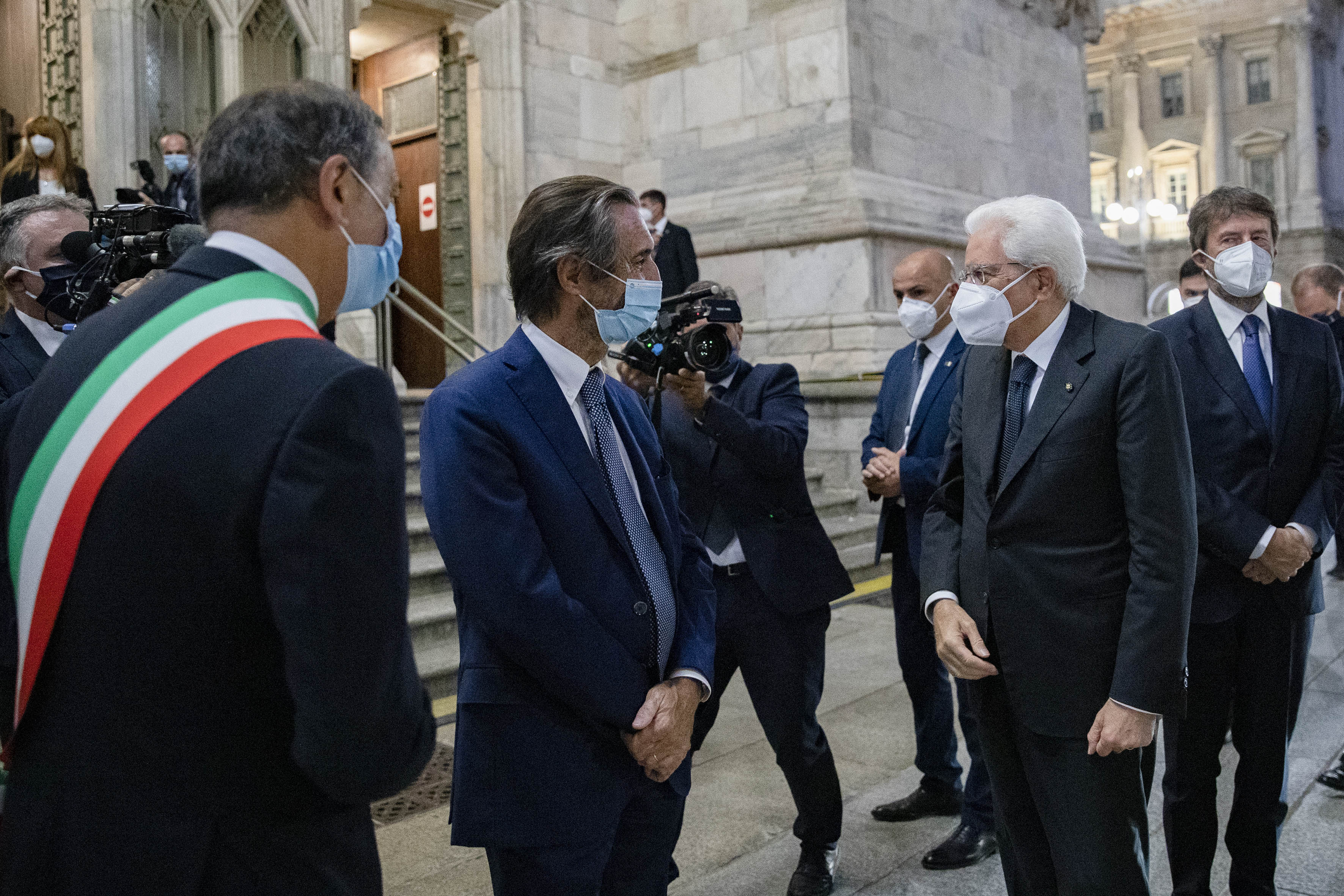 Il Presidente della Repubblica Sergio Mattarella al Duomo di Milano, con il Ministro dei Beni Culturali Dario Franceschini, Attilio Fontana, Presidente della Regione Lombardia, e Giuseppe Sala, Sindaco di Milano, in occasione della Messa da Requiem di Giuseppe Verdi,in memoria delle vittime del Covid-19