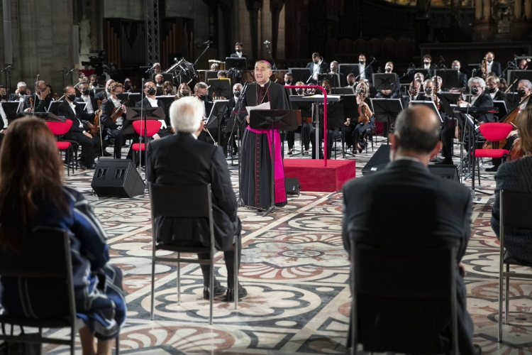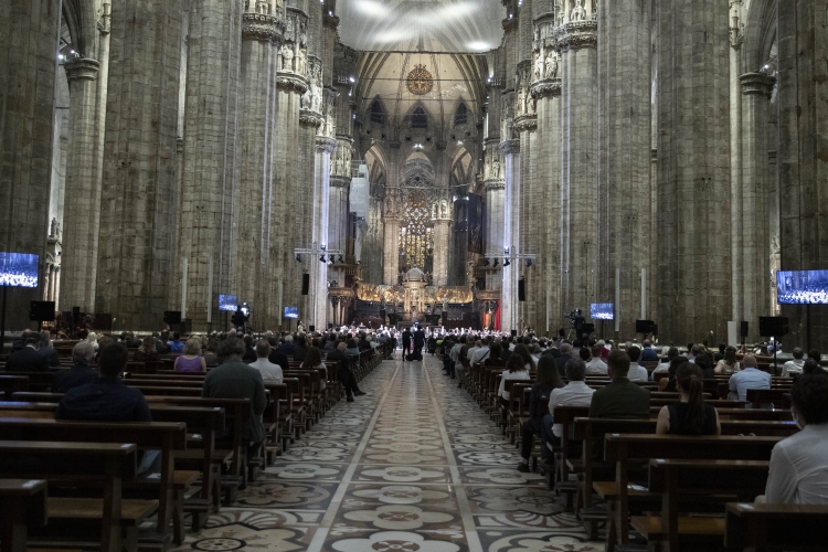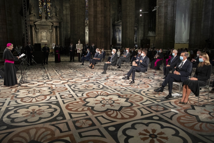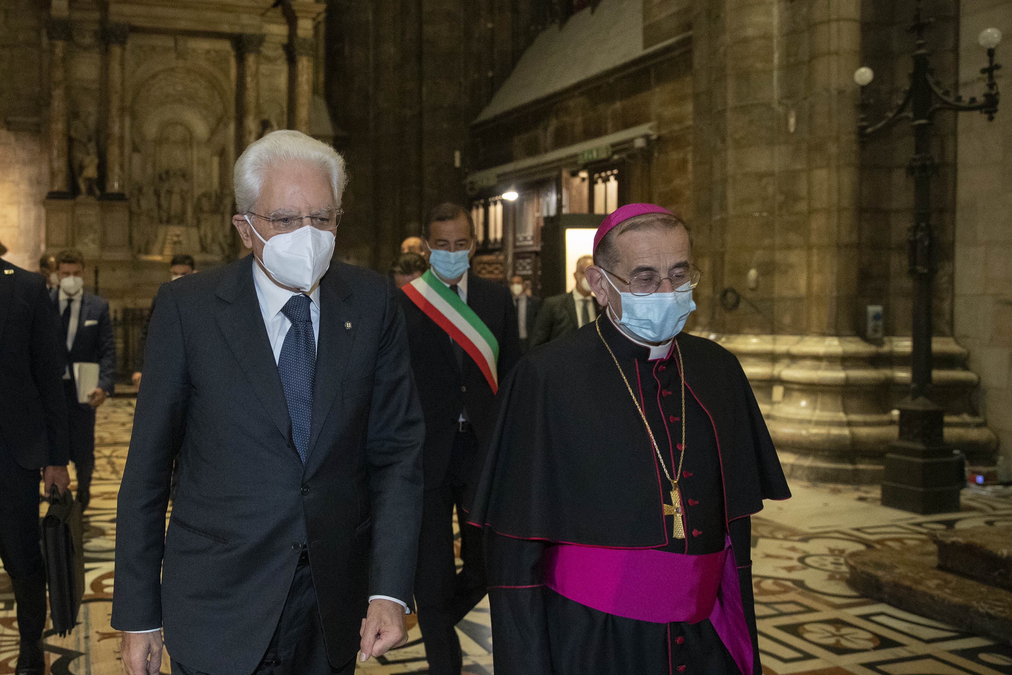 Il Presidente della Repubblica Sergio Mattarella al Duomo di Milano, con Sua Ecc. Rev.ma Mons. Mario Enrico Delpini, Arcivescovo di Milano, in occasione della Messa da Requiem di Giuseppe Verdi,in memoria delle vittime del Covid-19