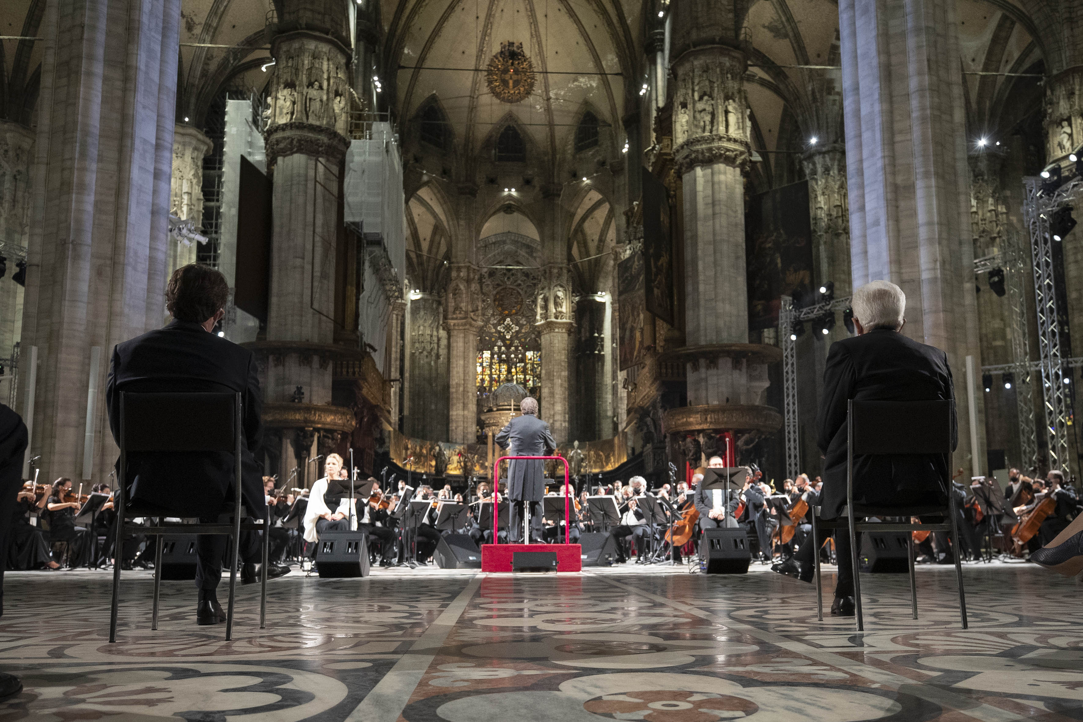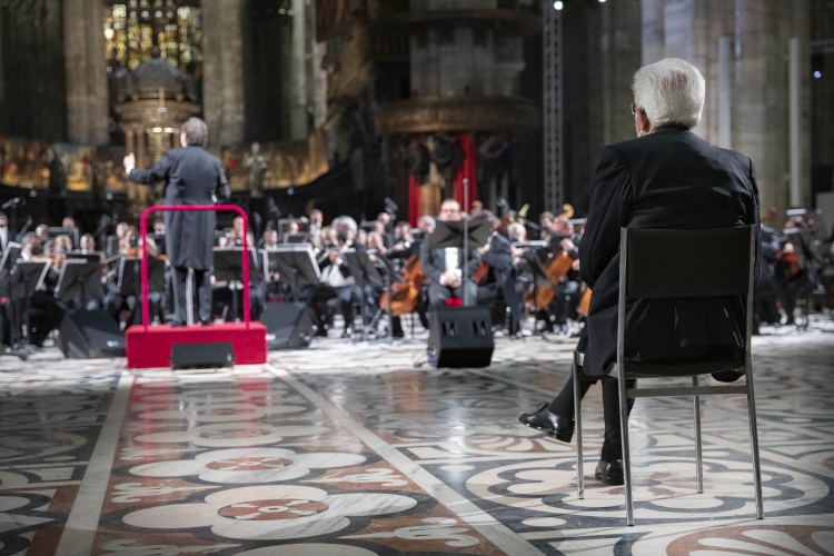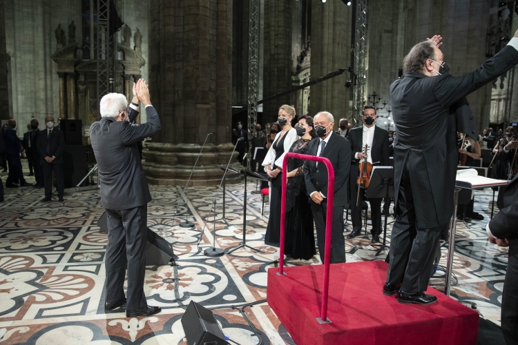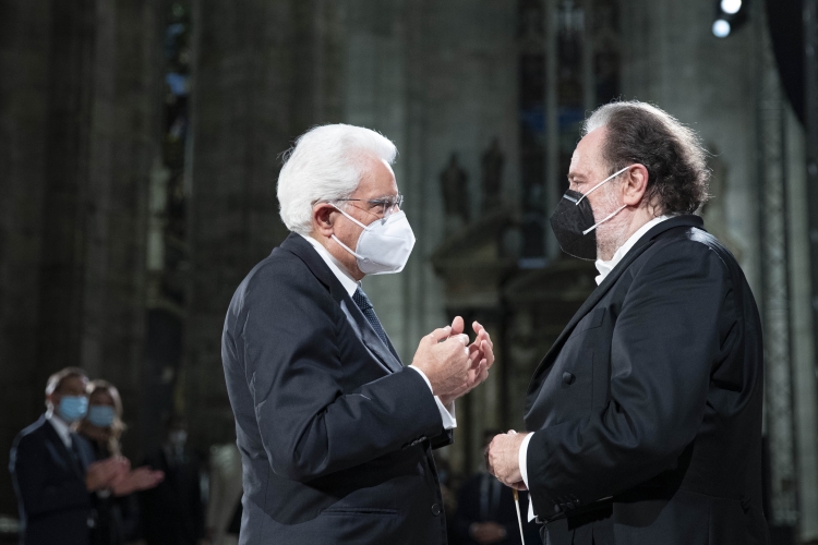 Il Presidente della Repubblica Sergio Mattarella al Duomo di Milano,con il M° Riccardo Chailly,in occasione della Messa da Requiem di Giuseppe Verdi,in memoria delle vittime del Covid-19