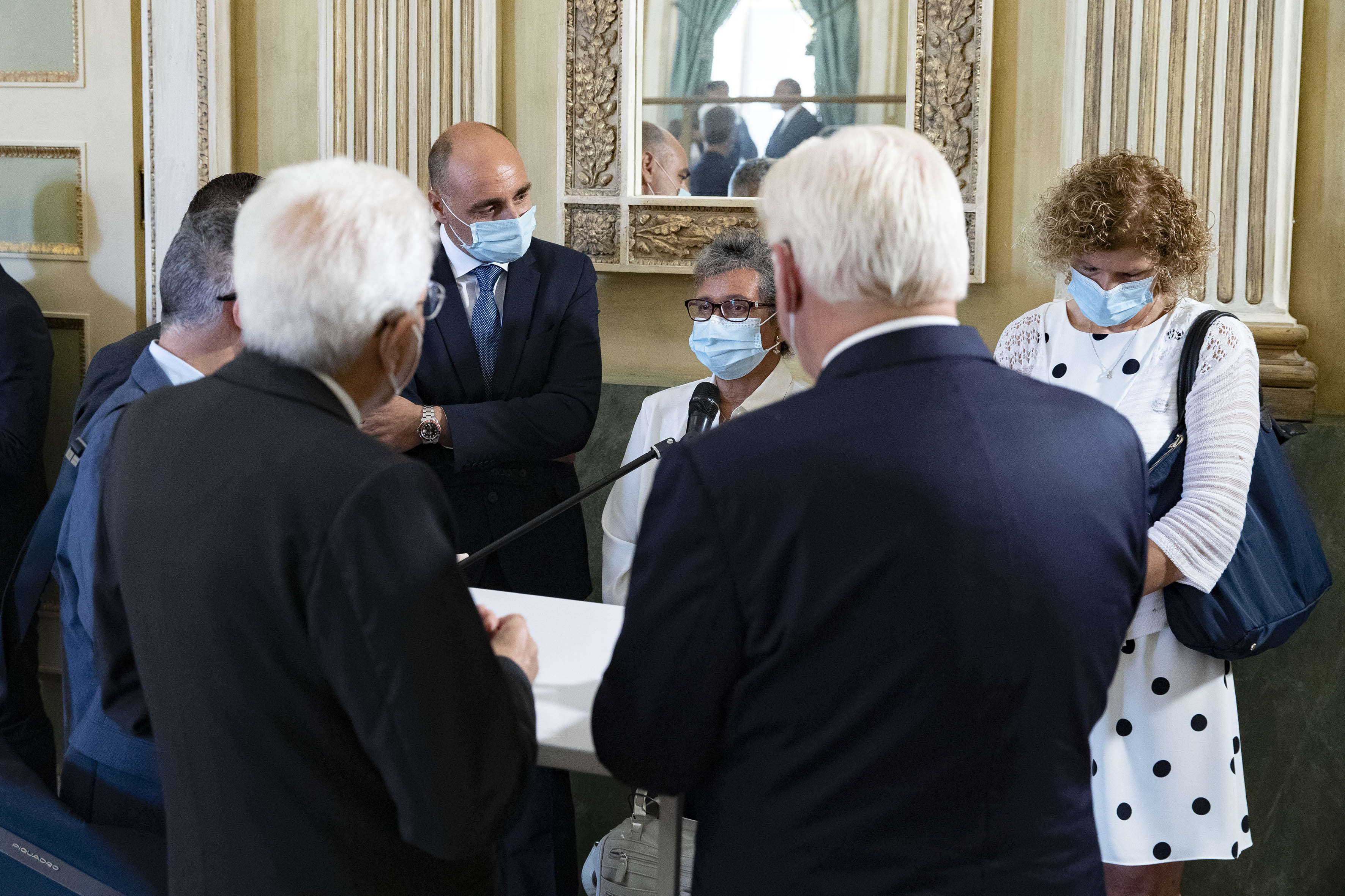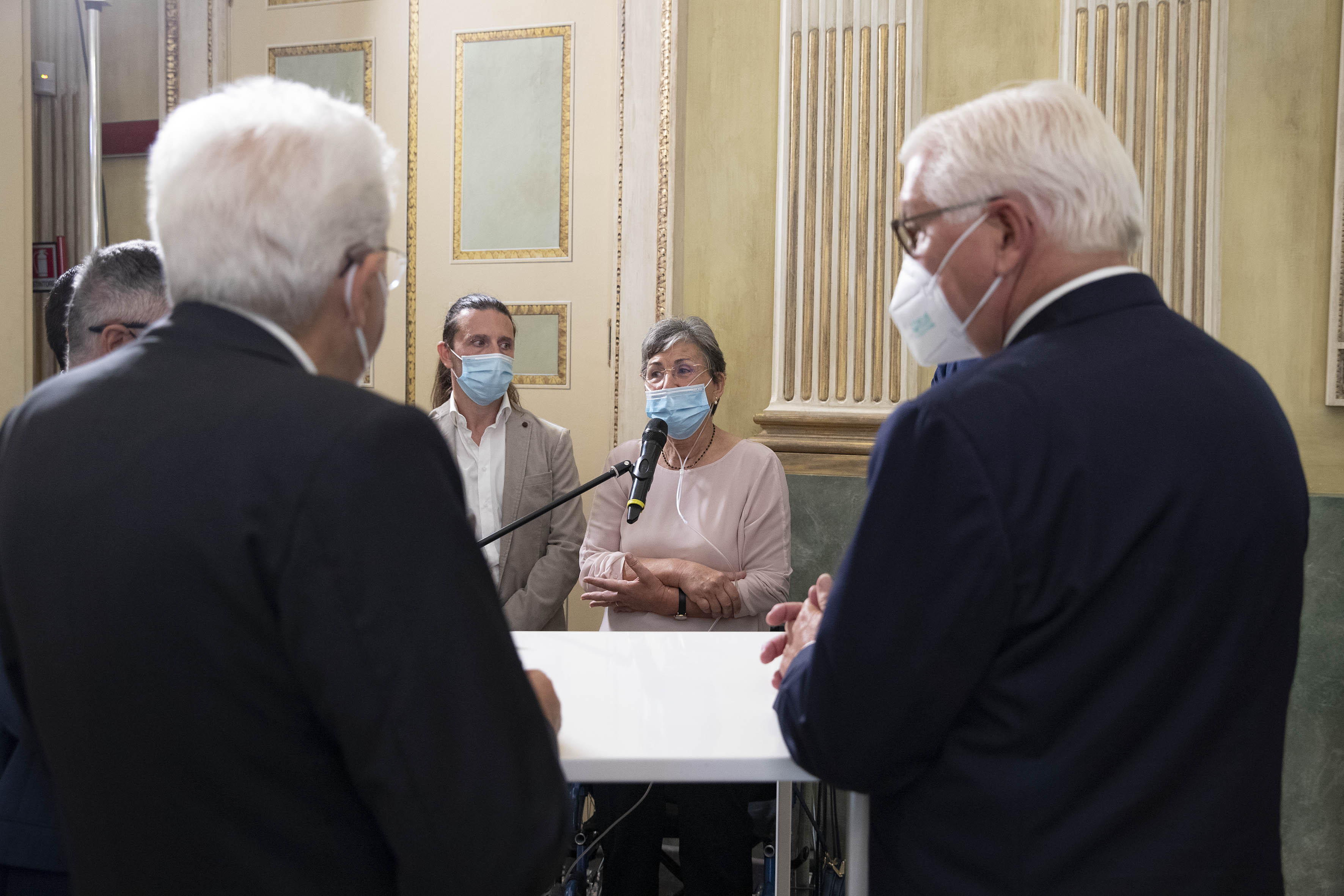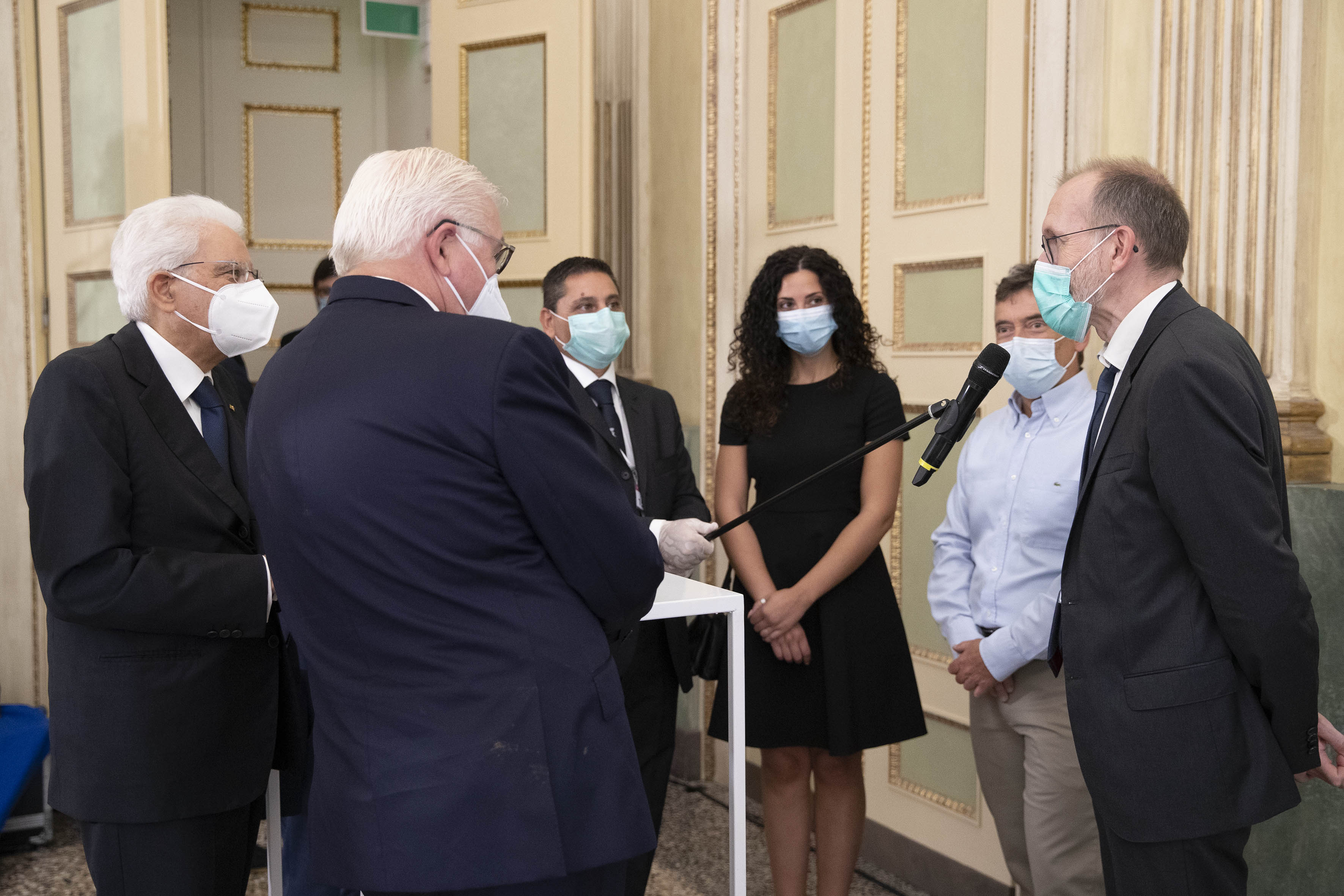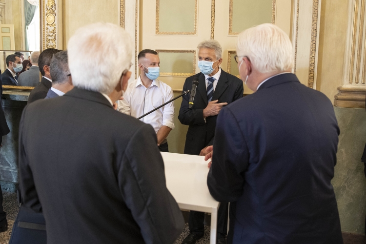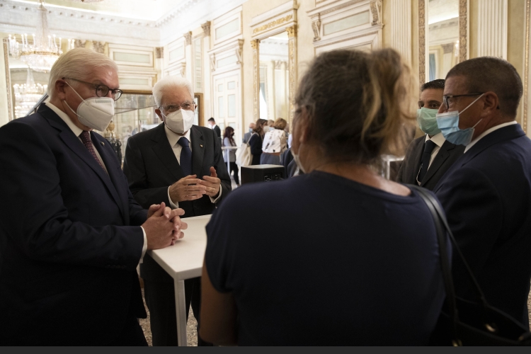 Il Presidente Sergio Mattarella e il Presidente della Repubblica Federale di Germania Frank-Walter Steinmeier incontrano personale medico, paramedico e volontario ed ex pazienti italiani ricoverati in strutture sanitarie tedesche