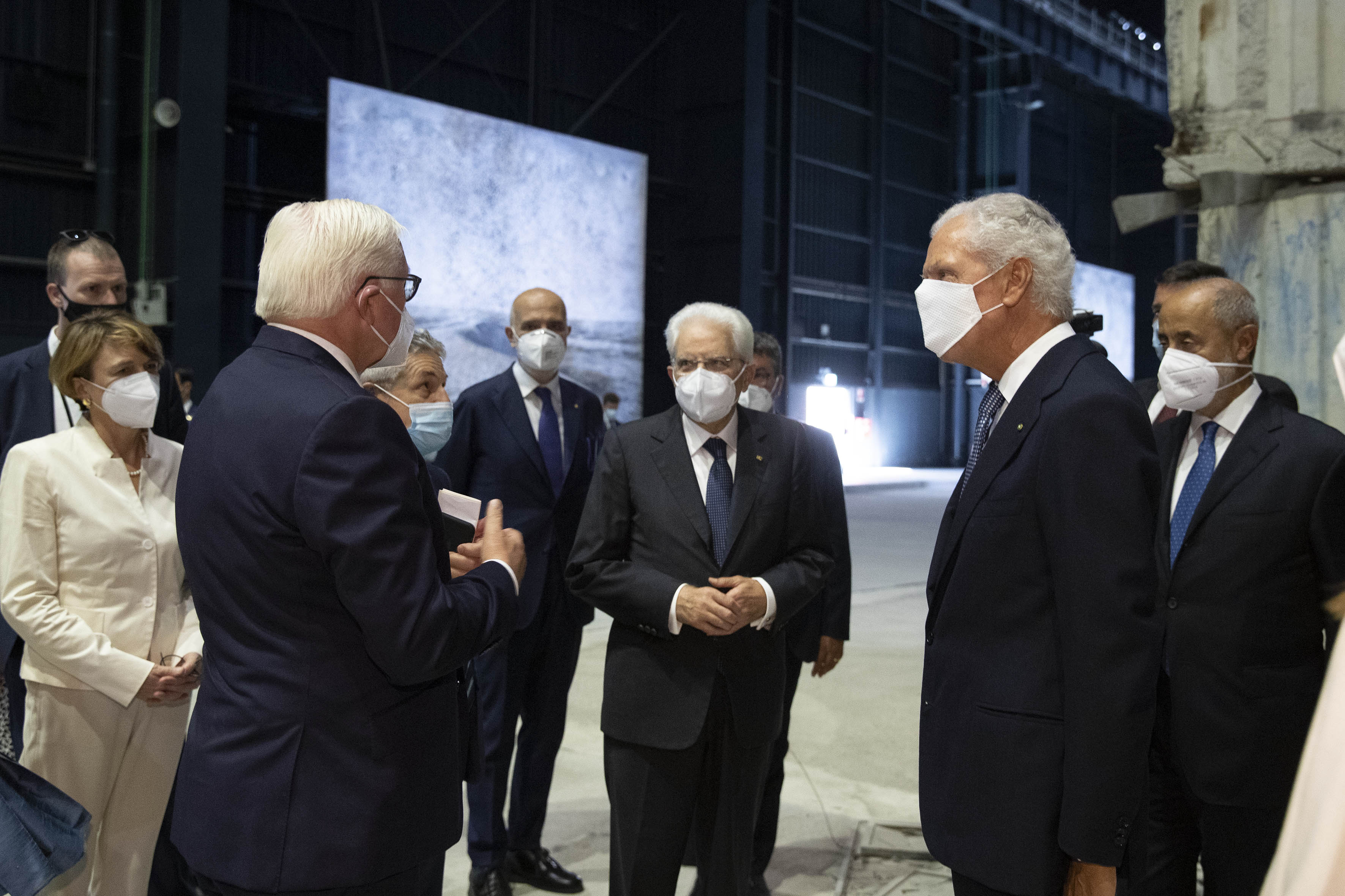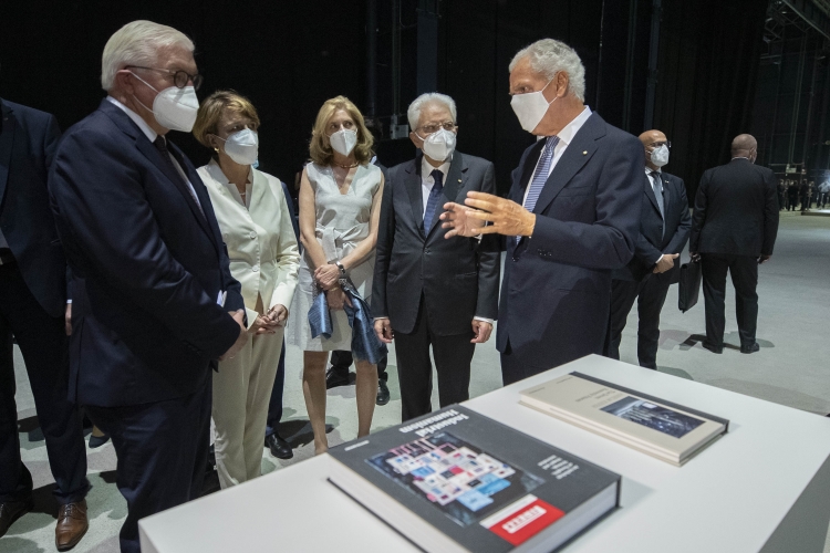 Il Presidente Sergio Mattarella e il Presidente della Repubblica Federale di Germania Frank-Walter Steinmeier, in Pirelli HangarBicocca, con Marco Tronchetti Provera, Presidente della Fondazione Pirelli per il panel di studio dal titolo “La rinascita al tempo del Covid”