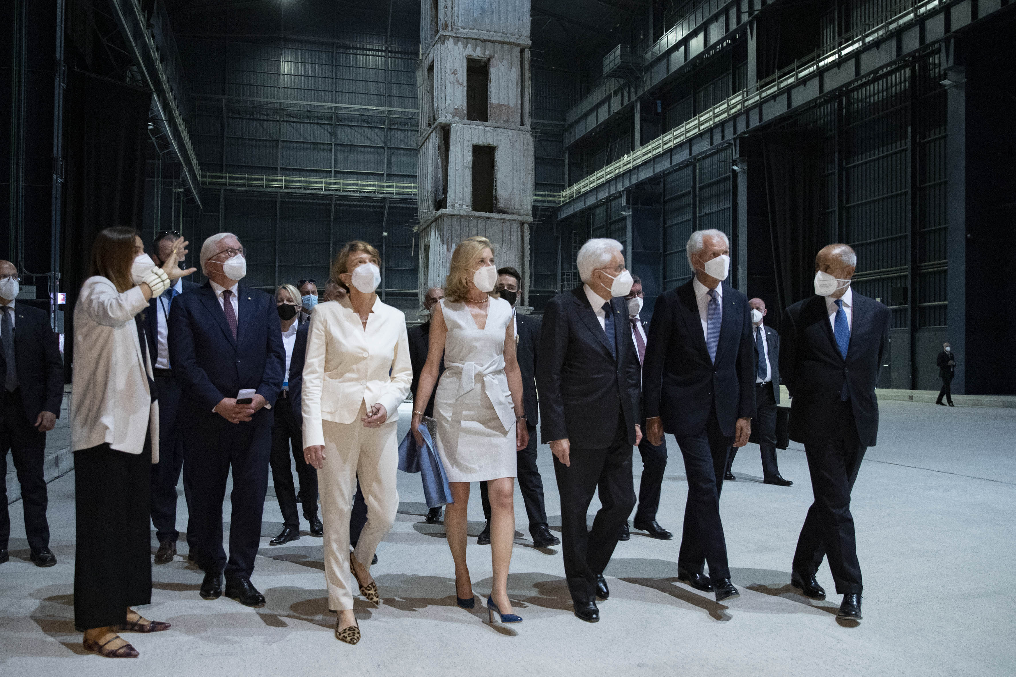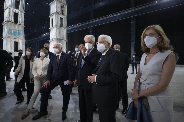 Il Presidente Sergio Mattarella e la Sig.ra Laura, con il Presidente della Repubblica Federale di Germania Frank-Walter Steinmeier e la Signora Elke Büdenbender, in Pirelli HangarBicocca, per il panel di studio dal titolo “La rinascita al tempo del Covid”