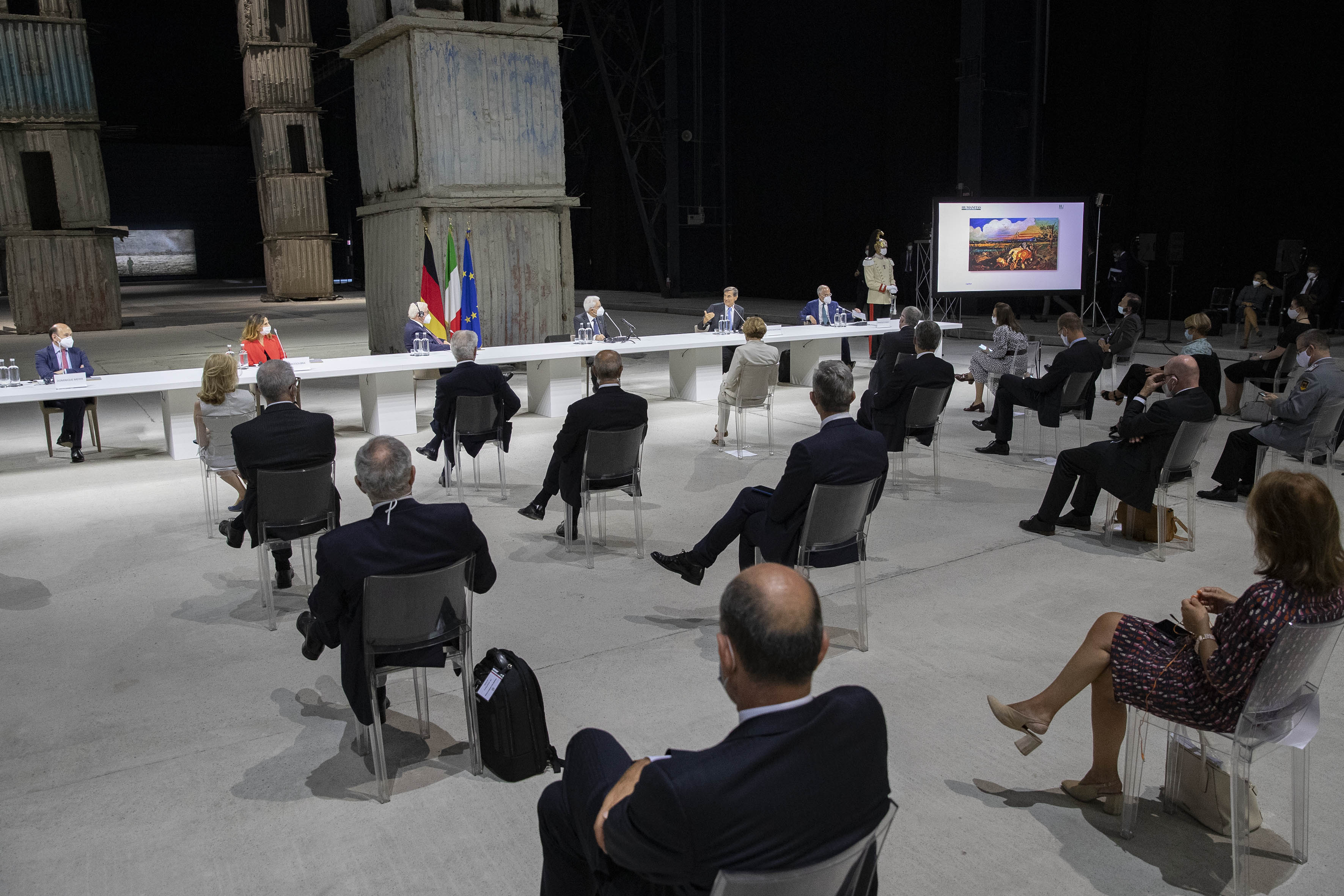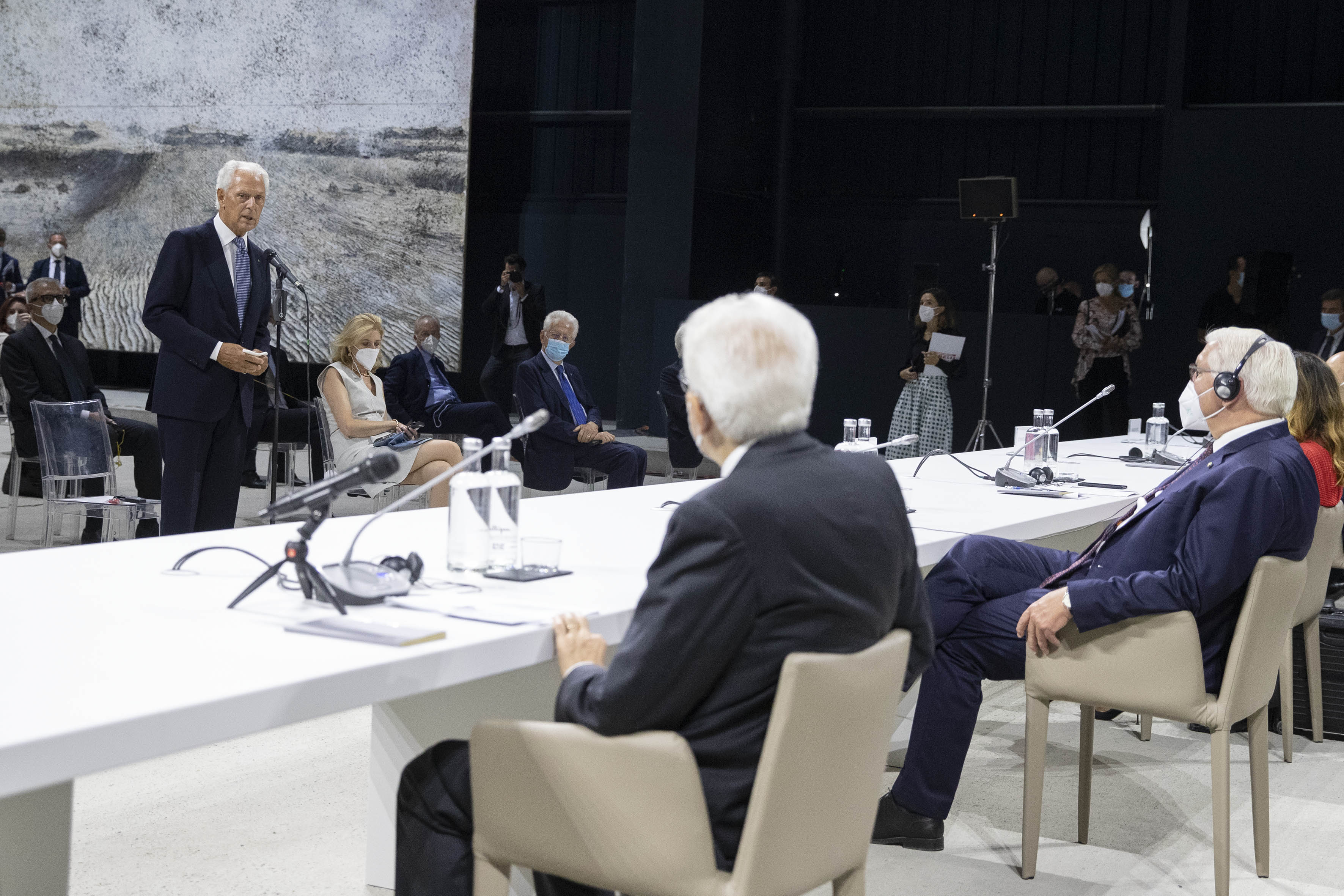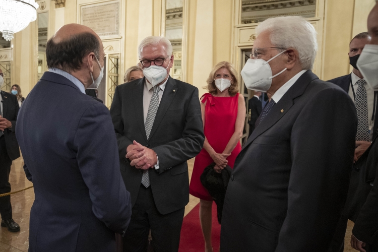 Il Presidente Sergio Mattarella e il Presidente della Repubblica Federale di Germania Frank-Walter Steinmeier, con Marco Tronchetti Provera, Presidente della Fondazione Pirelli per il panel di studio dal titolo “La rinascita al tempo del Covid”.