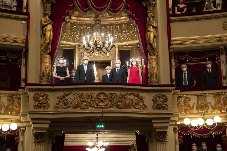Il Presidente Sergio Mattarella e la Sig.ra Laura,con il Presidente della Repubblica Federale di Germania Frank-Walter Steinmeier e la Signora Elke Büdenbender al Teatro alla Scala per il concerto diretto dal Maestro Riccardo Chailly,Sinfonia n.9 in re minore op. 125 di Ludwing van Beethoven