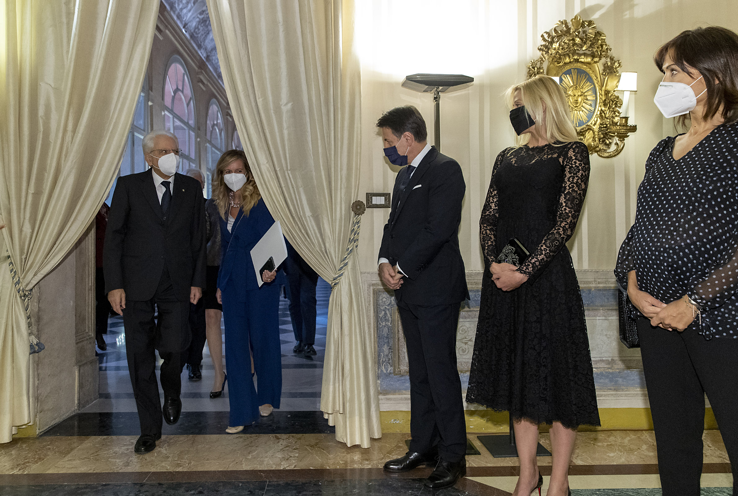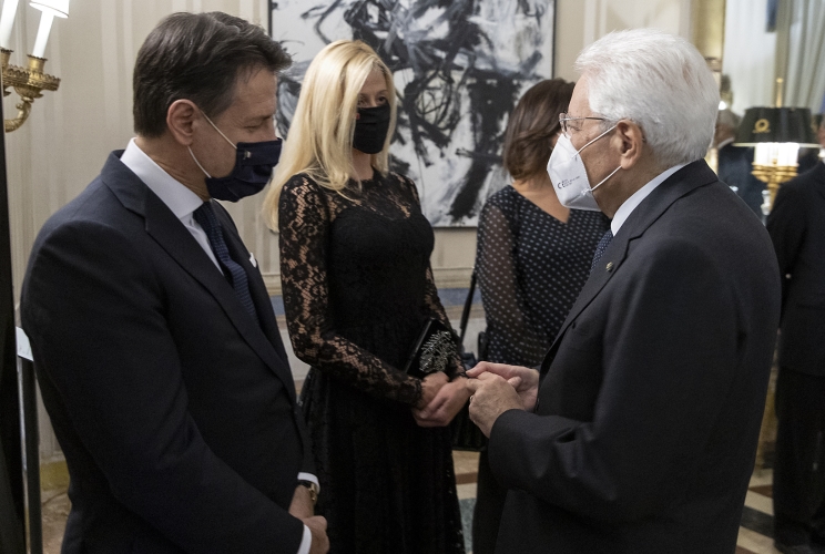 Il Presidente Mattarella saluta il Presidente del Consiglio Conte in occasione del "Concerto per Dante" eseguito dall’Orchestra giovanile “Luigi Cherubini” con il Coro dell’Accademia di Santa Cecilia, diretto dal Maestro Riccardo Muti