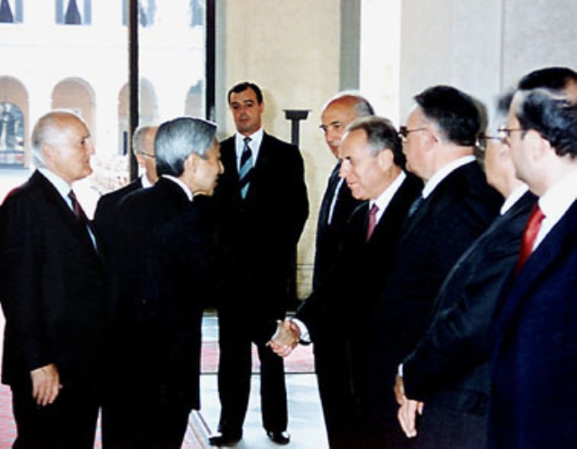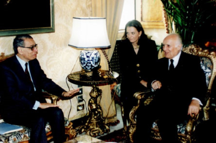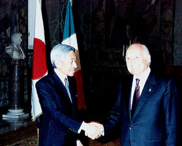 Il Presidente Scàlfaro stringe la mano all'Imperatore del Giappone in visita di stato in Italia, 6 settembre 1993