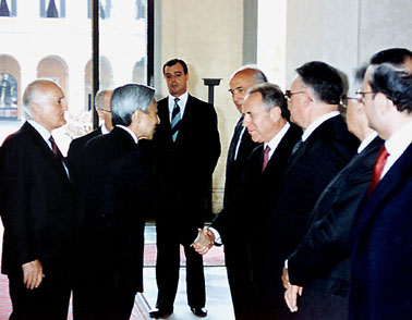 Il Presidente Scàlfaro con l'Imperatore del Giappone in visita di stato in Italia che saluta personalità, 6 settembre 1993