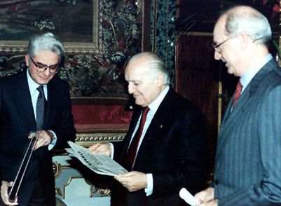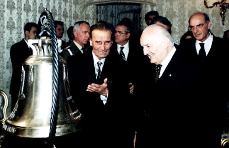 Il Presidente Scàlfaro con i rappresentanti della Pontificia Fonderia di Campane di Agnone. 26 marzo 1999