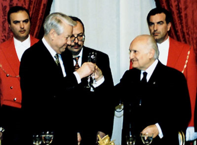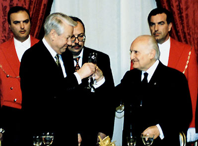 Il Presidente Scàlfaro durante il brindisi con il Presidente della Federazione Russa Boris Eltsin in visita ufficiale in Italia. 9 febbraio 1998