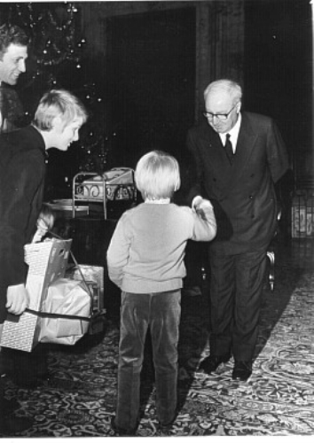 Il Presidente Saragat mentre consegna la befana ai figli dei dipendenti del Quirinale