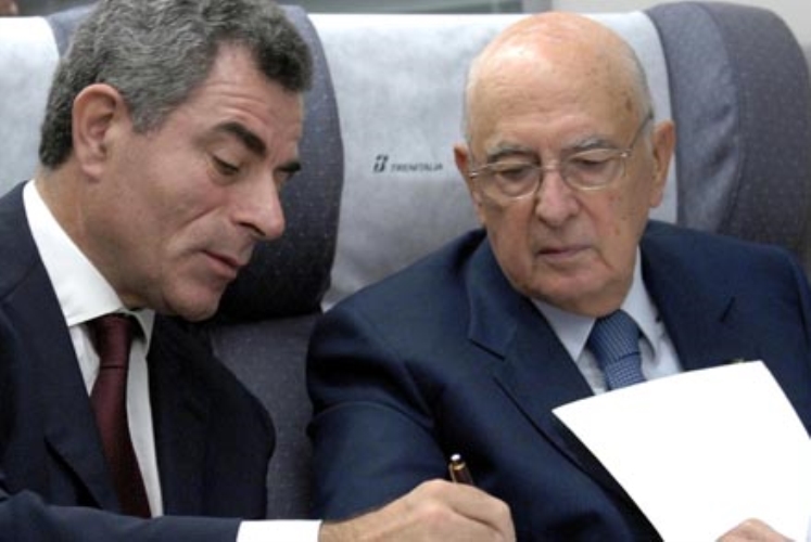 Il Presidente Giorgio Napolitano con Mauro Moretti, Amministratore Delegato delle Ferrovie dello Stato durante il viaggio per Mergellina
