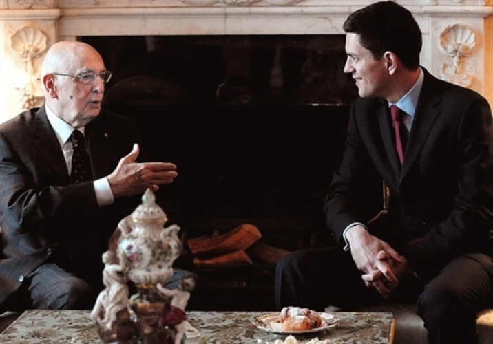 Il Presidente Giorgio Napolitano a colloquio con il Segretario di Stato per gli Affari Esteri, David Wright Miliband, in occasione dell'incontro in Ambasciata d'Italia