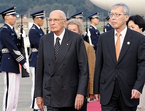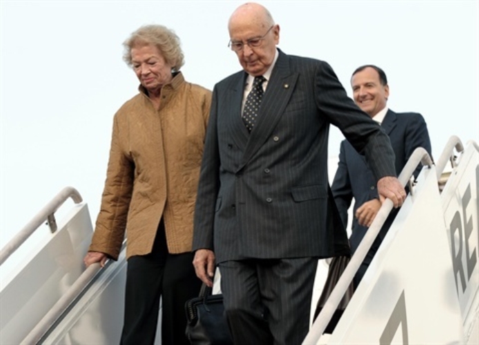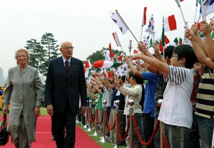 Il Presidente Giorgio Napolitano con la moglie Clio al suo arrivo nella Repubblica di Corea