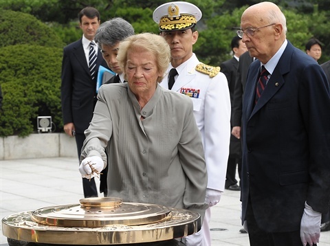 Il Presidente Giorgio Napolitano e la moglie Clio durante il rito dell'incenzo dopo aver deposto una corona di fiori al Memorial Tower