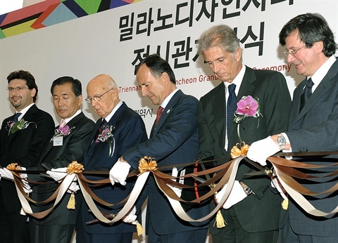 Taglio del nastro per l'inaugurazione del Palazzo della Triennale di Arte di Milano presente il Capo dello Stato Giorgio Napolitano ed il Sindaco di Incheon AHN San-soo