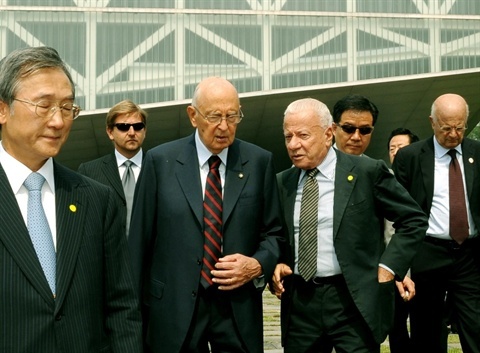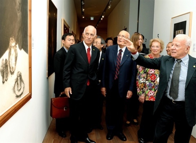 Il Presidente Giorgio Napolitano con il curatore della Mostra Achille Bonito Oliva e il Rettore dell'Università Lee Jang Moo al termine della visita alla Seoul National University
