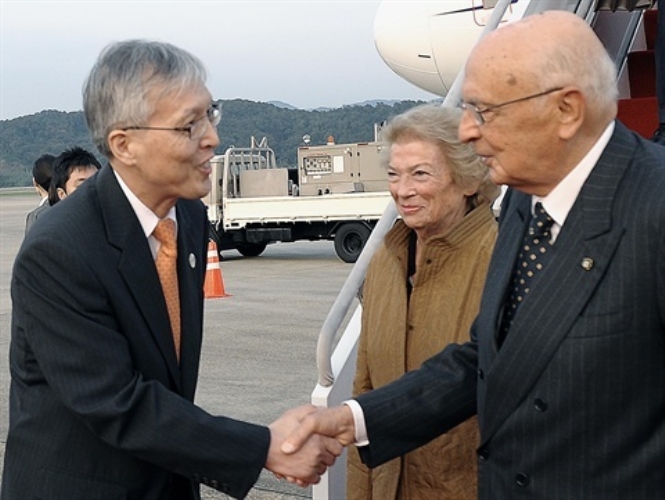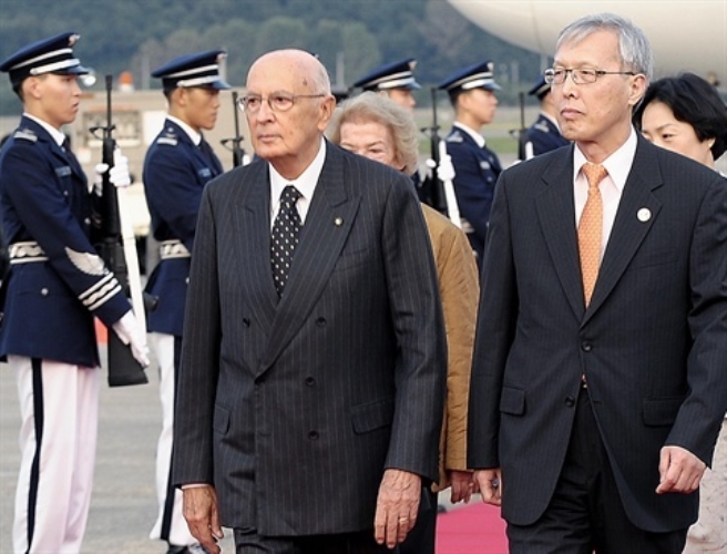 Il Presidente Giorgio Napolitano accolto dal Vice Ministro degli Esteri della Repubblica di Corea, Shin Kak-Soo, al suo arrivo
