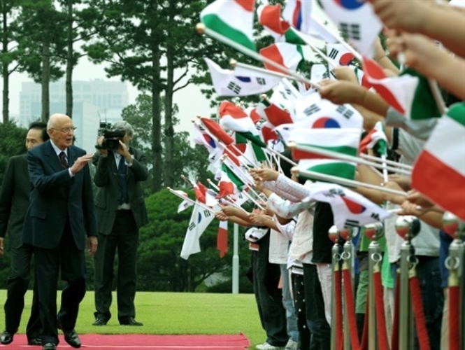 Il Presidente Giorgio Napolitano durante la cerimonia di accoglienza alla Residenza del Capo dello Stato coreano