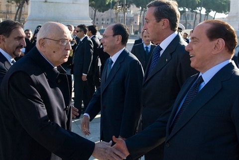 Il Presidente Giorgio Napolitano, accompagnato dal Ministro della Difesa Ignazio La Russa, al suo arrivo all'Altare della Patria saluta il Presidente del Consiglio Silvio Berlusconi, il Presidente della Camera Gianfranco Fini e il Presidente del Senato Renato Schifani