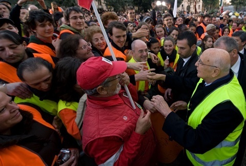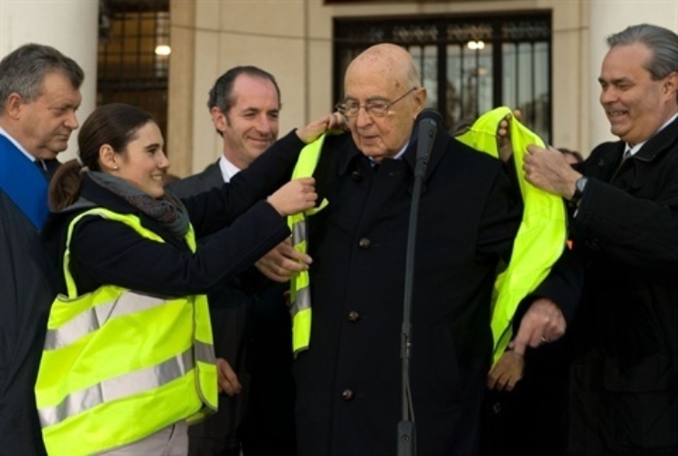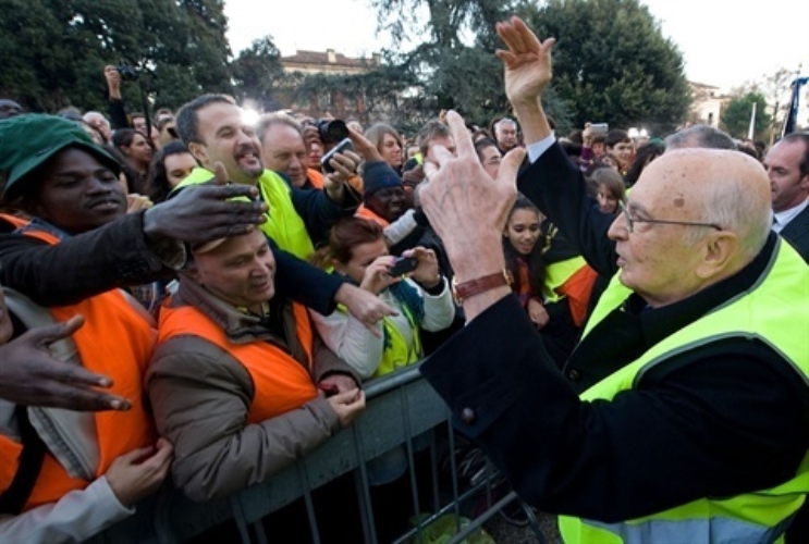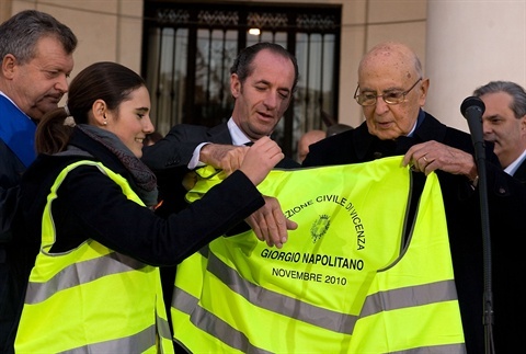 Il Presidente Giorgio Napolitano al termine dell'incontro con i volontari adoperatisi nelle fasi di soccorso dei Comuni alluvionati