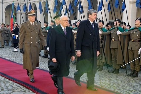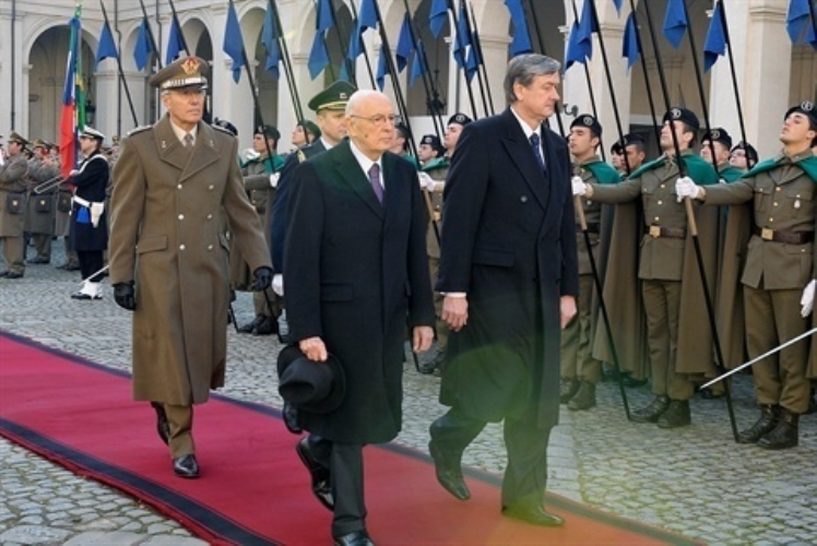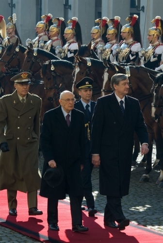 Il Presidente Giorgio Napolitano con il Sig. Danilo Türk, Presidente della Repubblica Slovena in visita di Stato in Italia, durante gli onori militari